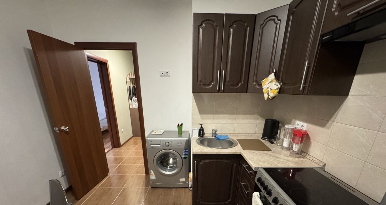 В квартире сделан косметический ремонт. На кухне есть вся необходимая мебель, установлены холодильник, стиральная машина, микроволновая печь. в комнате есть кровать. Квартира имеет балкон, с которого открывается вид на двор.