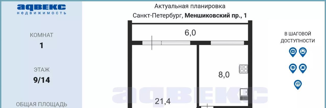 1-к кв. Санкт-Петербург Меншиковский просп., 1 (37.4 м²)