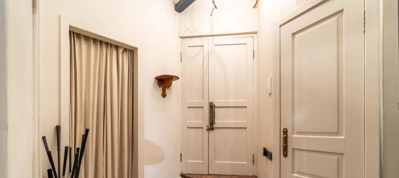 Большим достоинством квартиры являются её потолки — 3,4 метра. Полы деревянные. Толстые кирпичные стены создают особую тишину и уют.