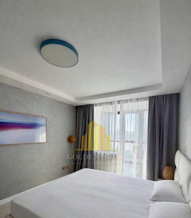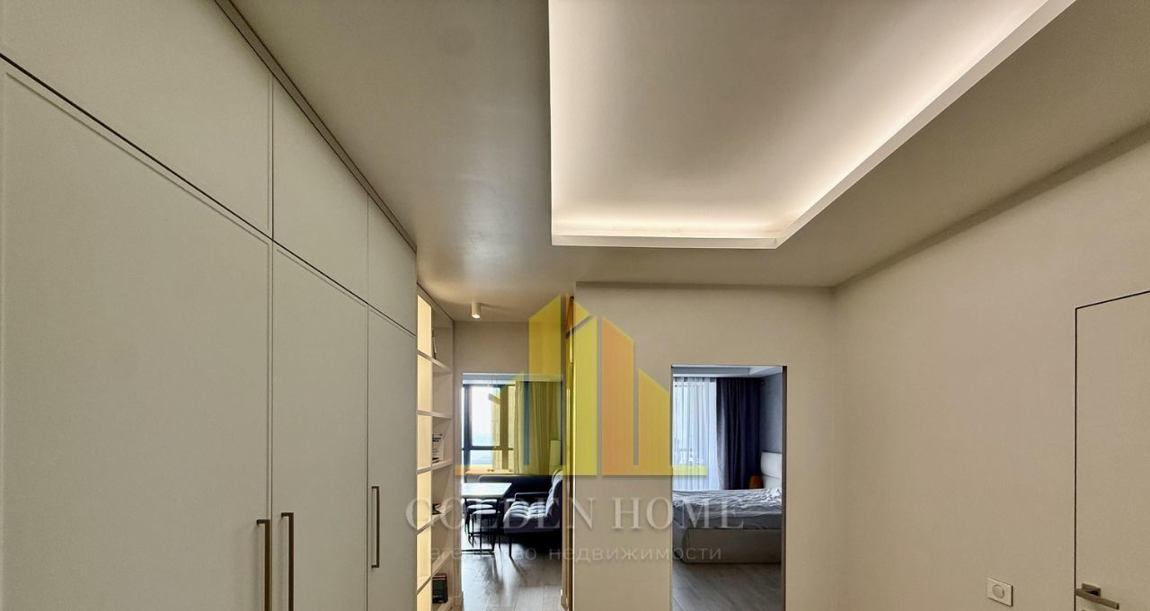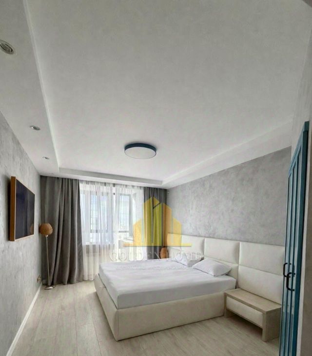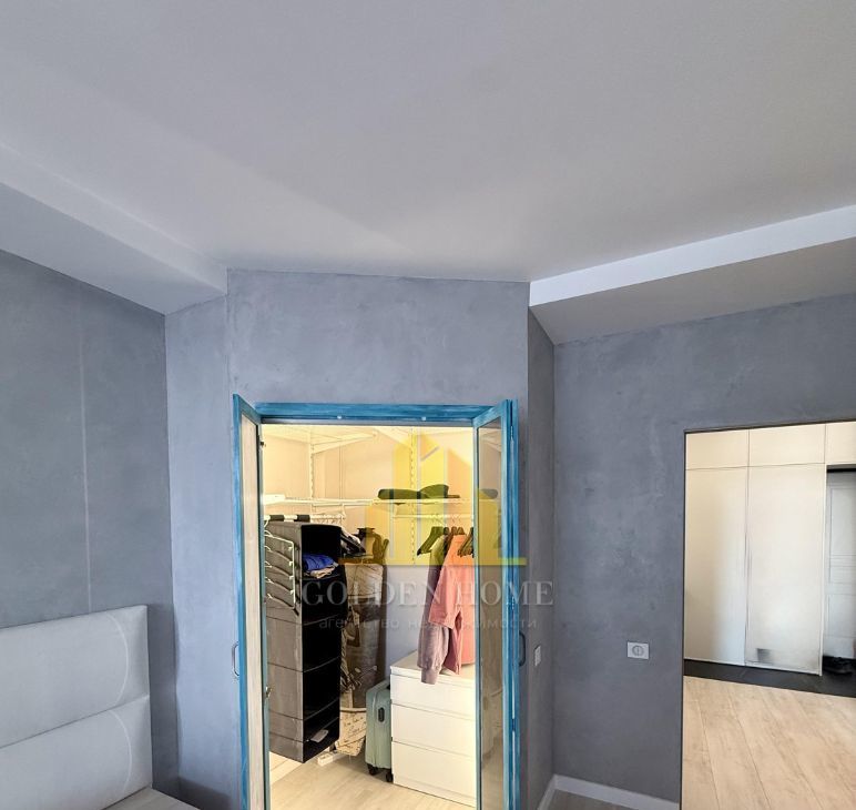 Спальня: Большая кровать 180х200 см, ТВ 55" и вместительная гардеробная.