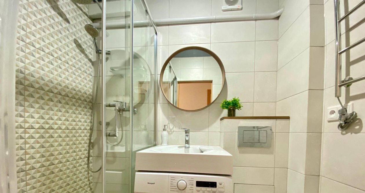 Санузел: встроенная стиральная машина на 5 кг, душевая с трапом в полу в плитке, унитаз на инсталляции, электрическое сушило на стене.