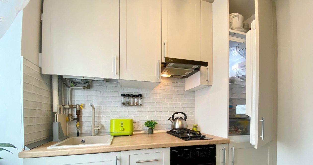 Кухня: встроенная мебель с ящиками, электрическая духовка, газовая варочная поверхность, большой холодильник с морозильной камерой, вытяжка, тостер, чайник, раскладной стол и 2 стула.