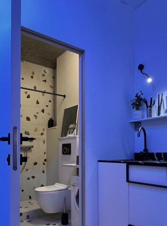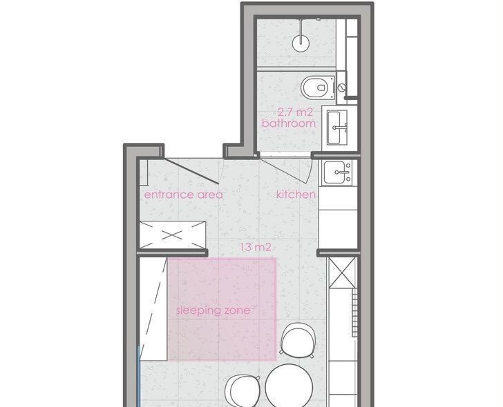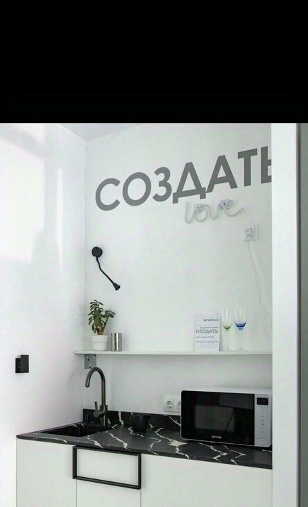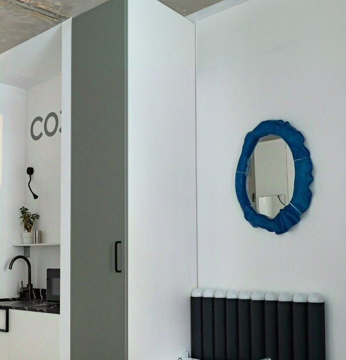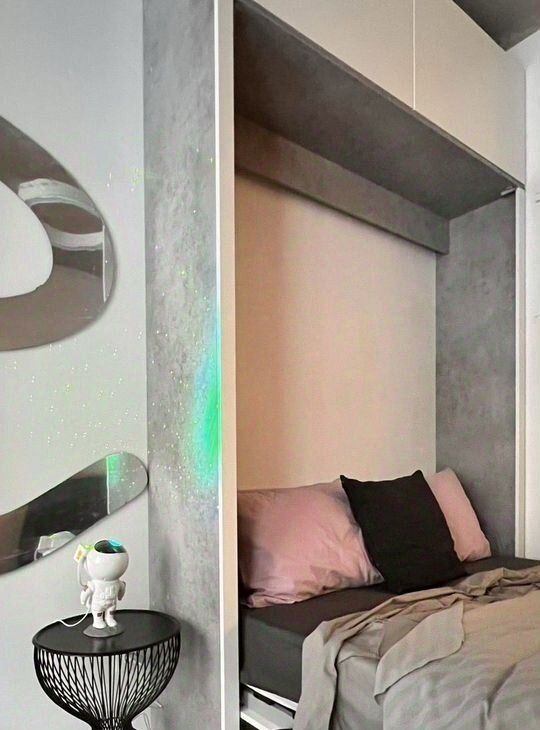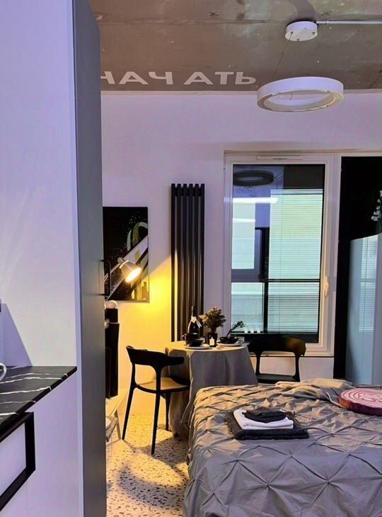 Комнату-трансформер вы можете настроить под себя — кровать убирается в стену, стол складывается, стулья штабелируются. Современным дизайн-решениям сопутствуют технически отработанные инженерные — регулируемые тёплые полы, настраиваемое освещение, душевая со встроенным трапом и инсталляция Tece, ручной душ на 3 режима Villeroy&Boch, встроенная в нише кухня с холодильником с морозильной камерой и микроволновая печь Gorenje с функцией гриль и различными режимами, индукционная варочная панель.