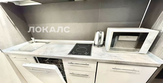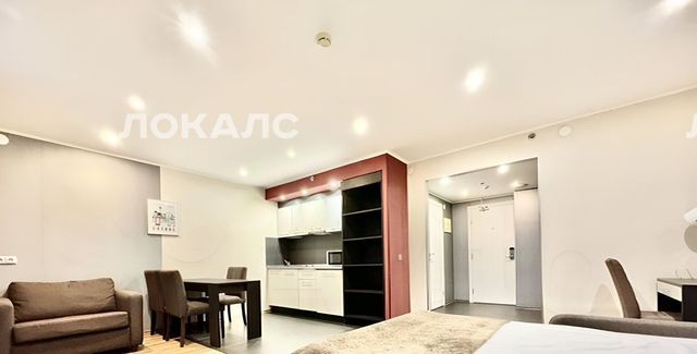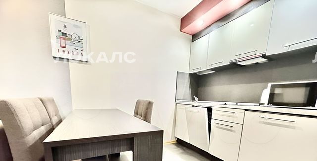 Установлена кухня, встроенный холодильник, посудомоечная машина, варочная поверхность, микроволновка, чайник, рабочее место, диван, обеденный стол;