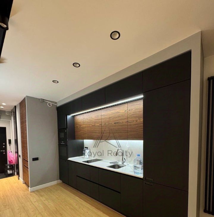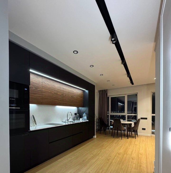Есть вся необходимая техника и мебель, в том числе посудомоечная машина, стиральная машина, духовой шкаф, холодильник, свч, кондиционер Вся техника встраиваемая.