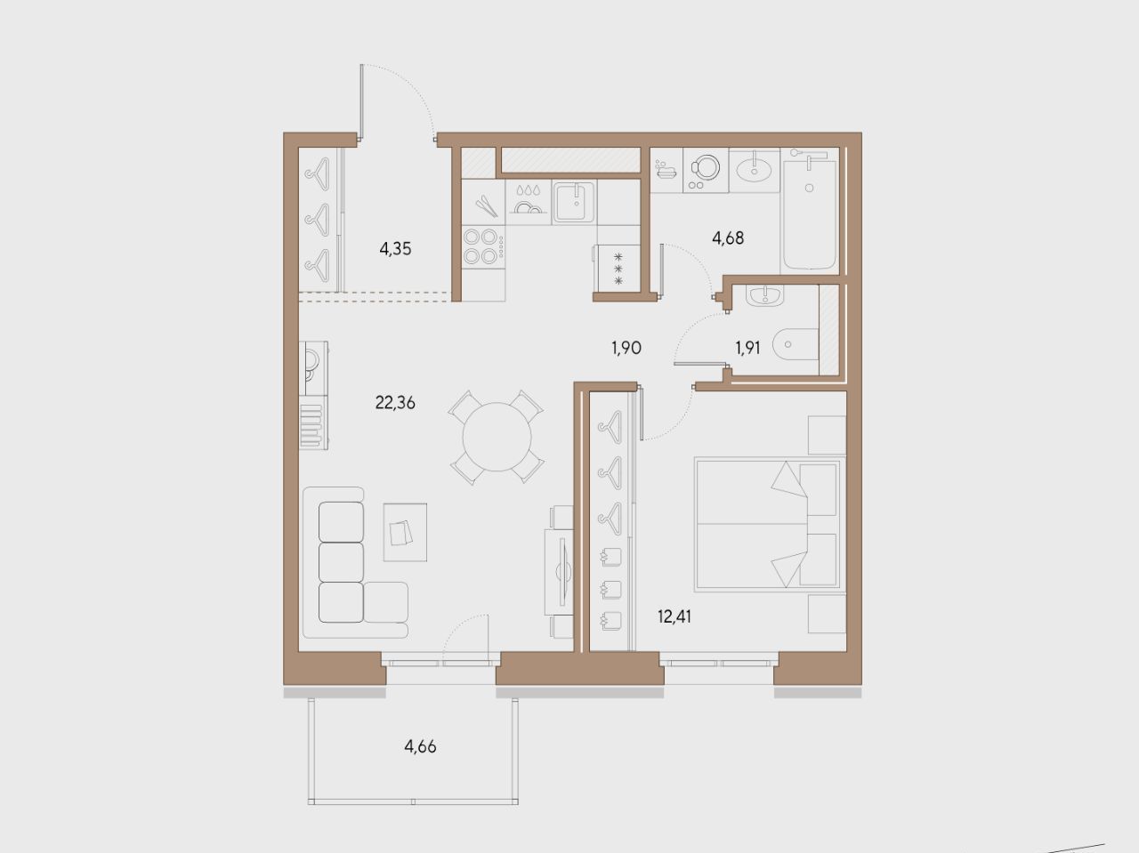 Формат 2-евро: кухня-гостиная 22,36 м² + спальня 12,41 м²
