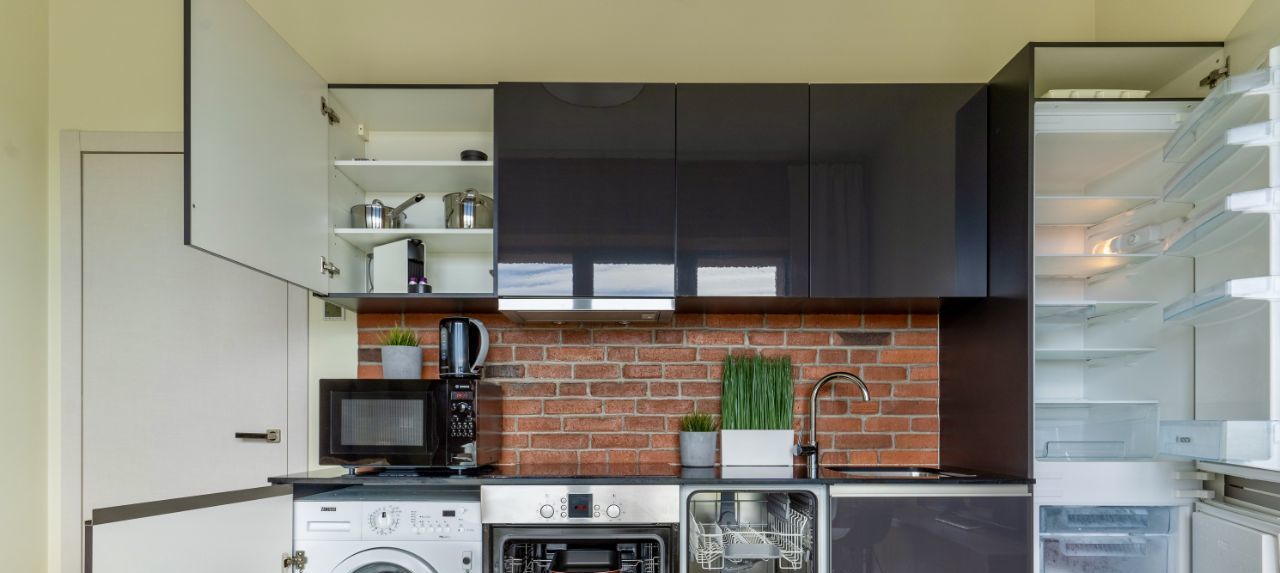 Встроенная кухня с большим холодильником и отдельной морозильной камерой, посудомоечной машиной, стиральной машиной , духовым шкафом , микроволновой печью
