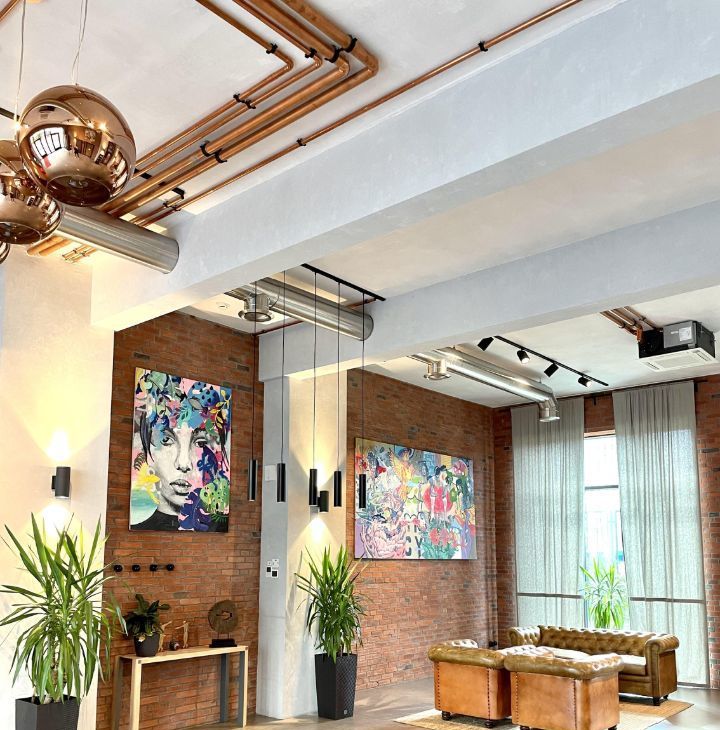 Установлена современная система рекуперации и кондиционирования воздуха ( несмотря на такие огромные окна , зимой очень тепло и комфортно).