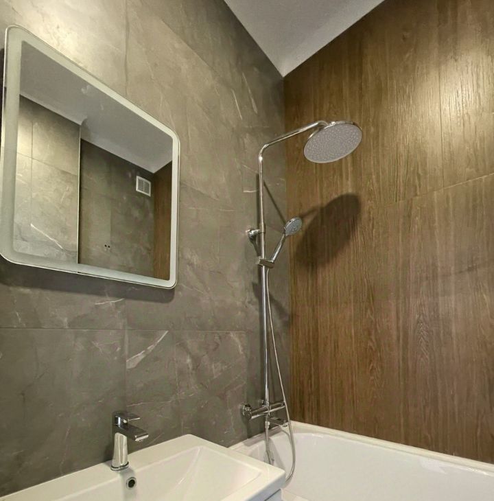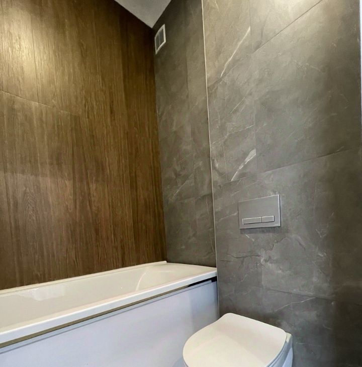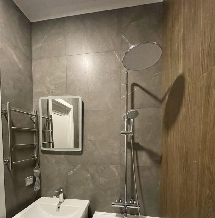 В санузле стены и пол облицованы комбинированной плиткой: акцентная с имитацией дерева и основная под камень. Электрический полотенцесушитель, зеркало со светильником. Все коммуникационные трубы зашиты в короба, предусмотрена автоматическая передача данных счетчиков.