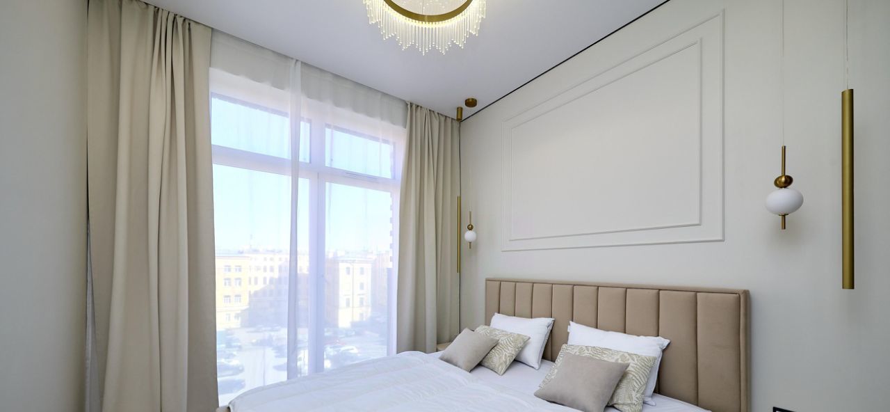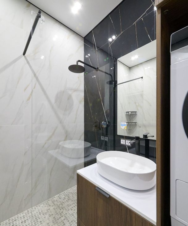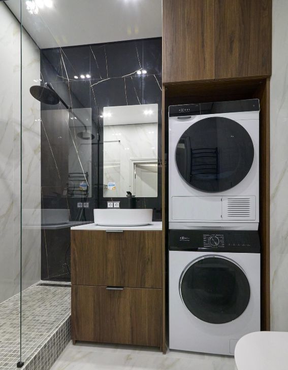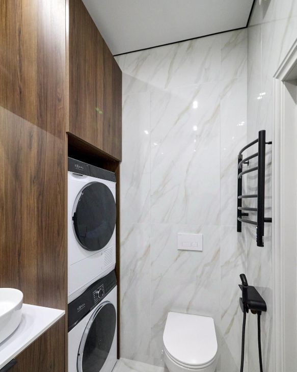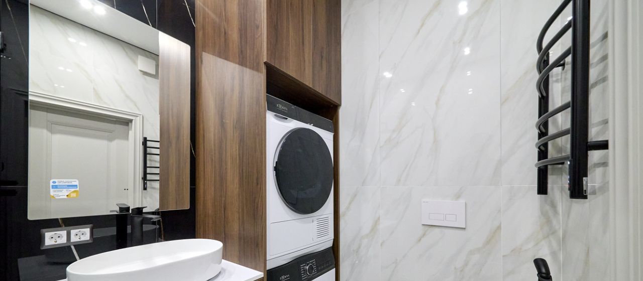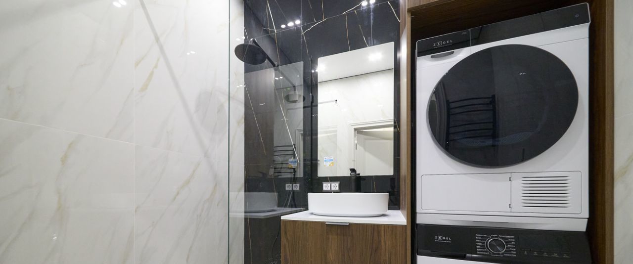 Совмещённый санузел оборудован стирально-сушильной колонной и гигиеническим душем. Из окон открывается вид на городские пейзажи. В доме имеется пассажирский и грузовой лифты, а также подземная парковка.