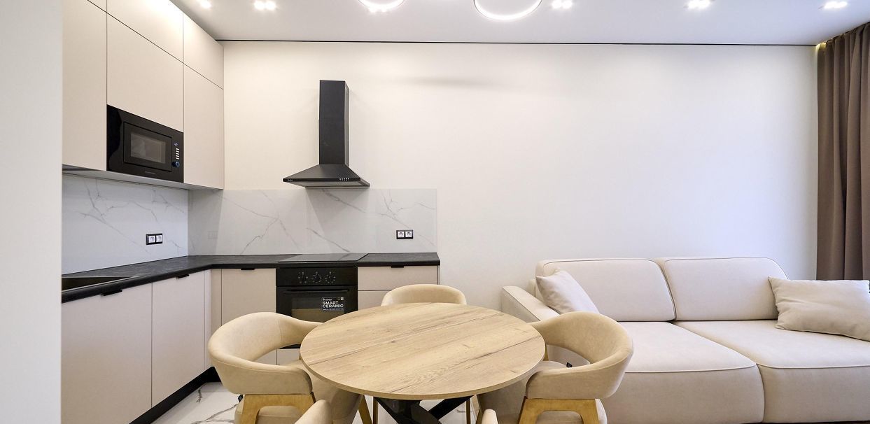 Сдаётся светлая однокомнатная квартира с дизайнерским ремонтом в современном монолитном доме. Просторная кухня площадью 17 м² оснащена всей необходимой техникой, включая холодильник, встроенную микроволновку и посудомоечную машину. В квартире есть кондиционер и телевизор.