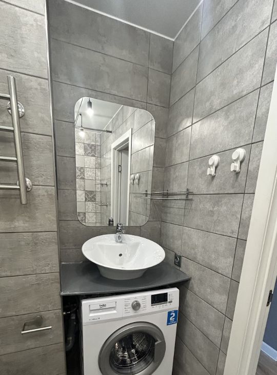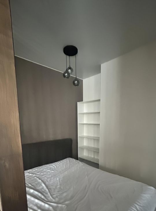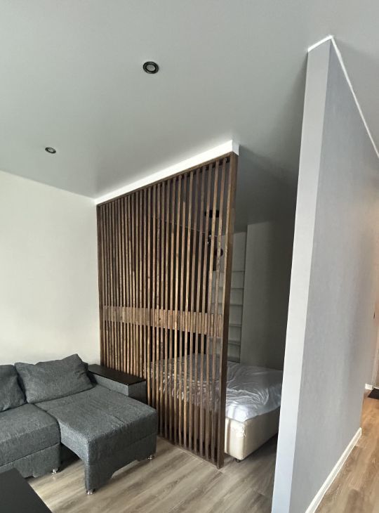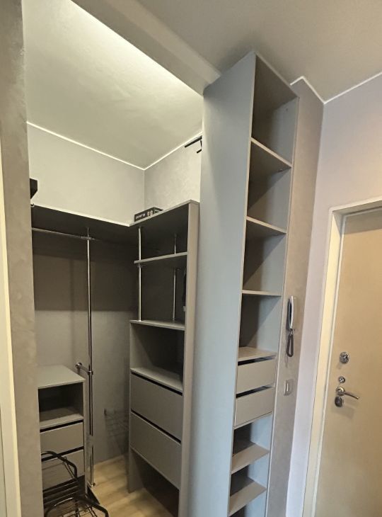 Квартира от застройщика ЮИТ. Ремонт не от застройщика. В квартире сделана перепланировка, комната совмещена наполовину с кухней. За счет этого есть больше пространства для отдыха и приема гостей. Полноценная двух спальная кровать огорожена декоративными панелями. Сделана гардеробная , что позволяет не нагружать квартиру шкафом. Есть стиральная машина, посудомоечная.