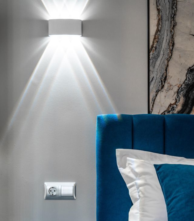 Двуспальная кровать (160*200) с удобным ортопедическим матрасом, прикроватные тумбы с подсветкой, диван, туалетный и журнальный столики.