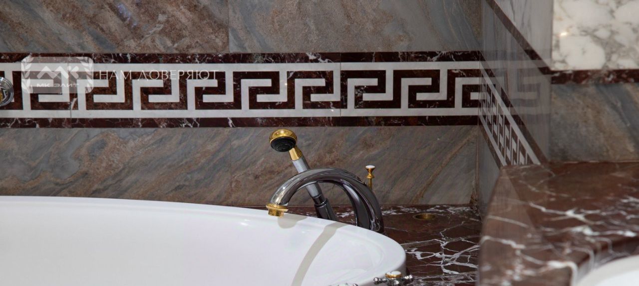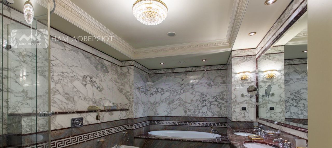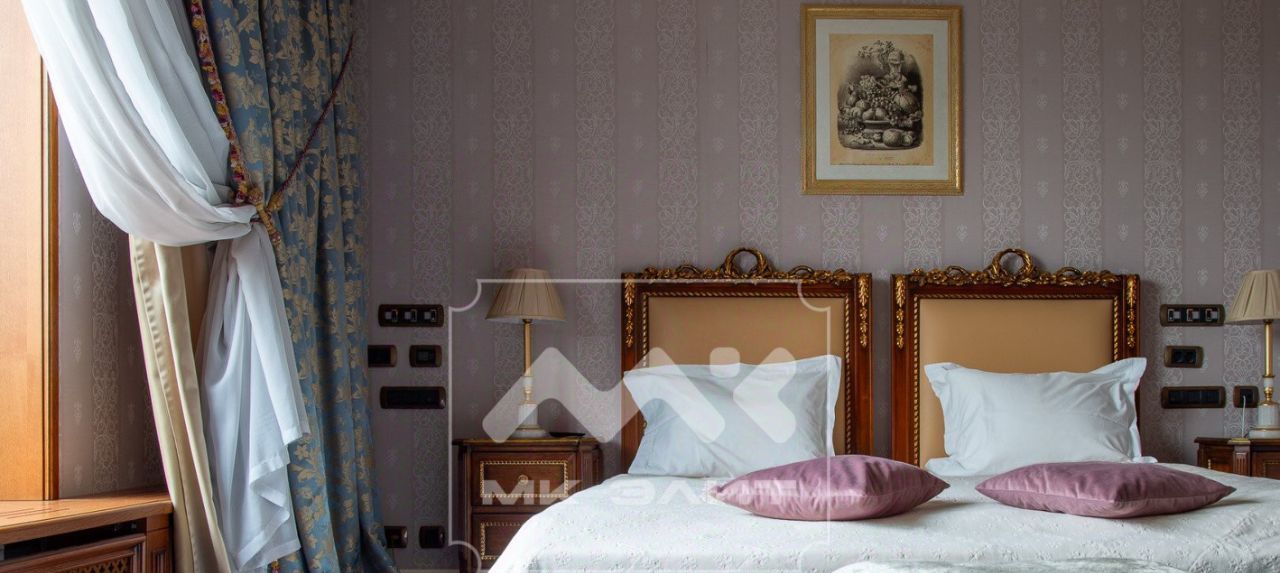 В отделке использованы эксклюзивные материалы: обои из шелковой ткани, оникс, мрамор, винтажная мебель.