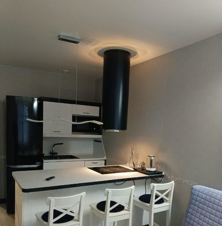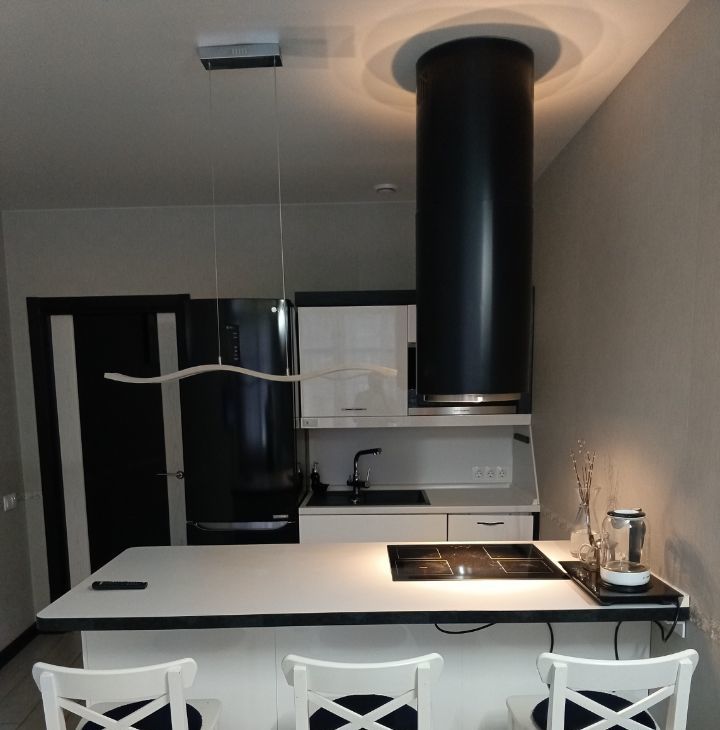 - эргономичная кухня, в которой есть ВСЁ: холодильник, плита,вытяжка, духовой шкаф, микроволновая печь, посудомойка, электрический чайник.