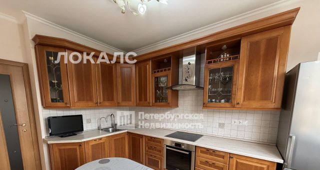 -Кухня выполнена из натурального дерева и имеет встроенную варочную панель, духовой шкаф и вытяжку от компании "BOSCH". Также присутствует холодильник, электрочайник.