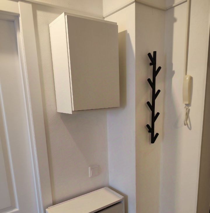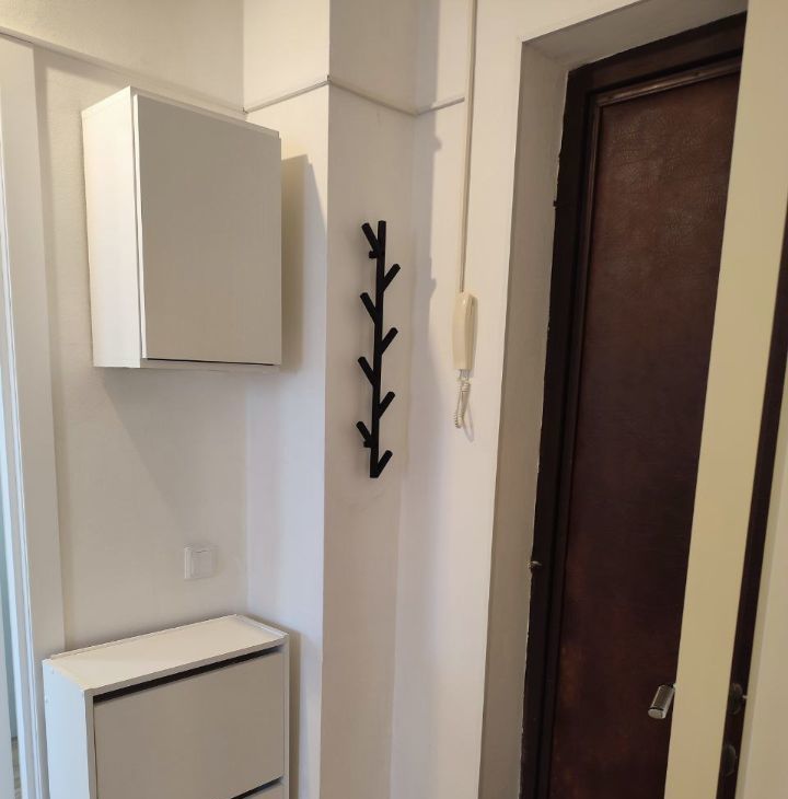 В прихожей шкаф для хранения верхней одежды, обувница, вешалка для сумок, зеркало.