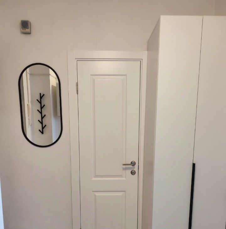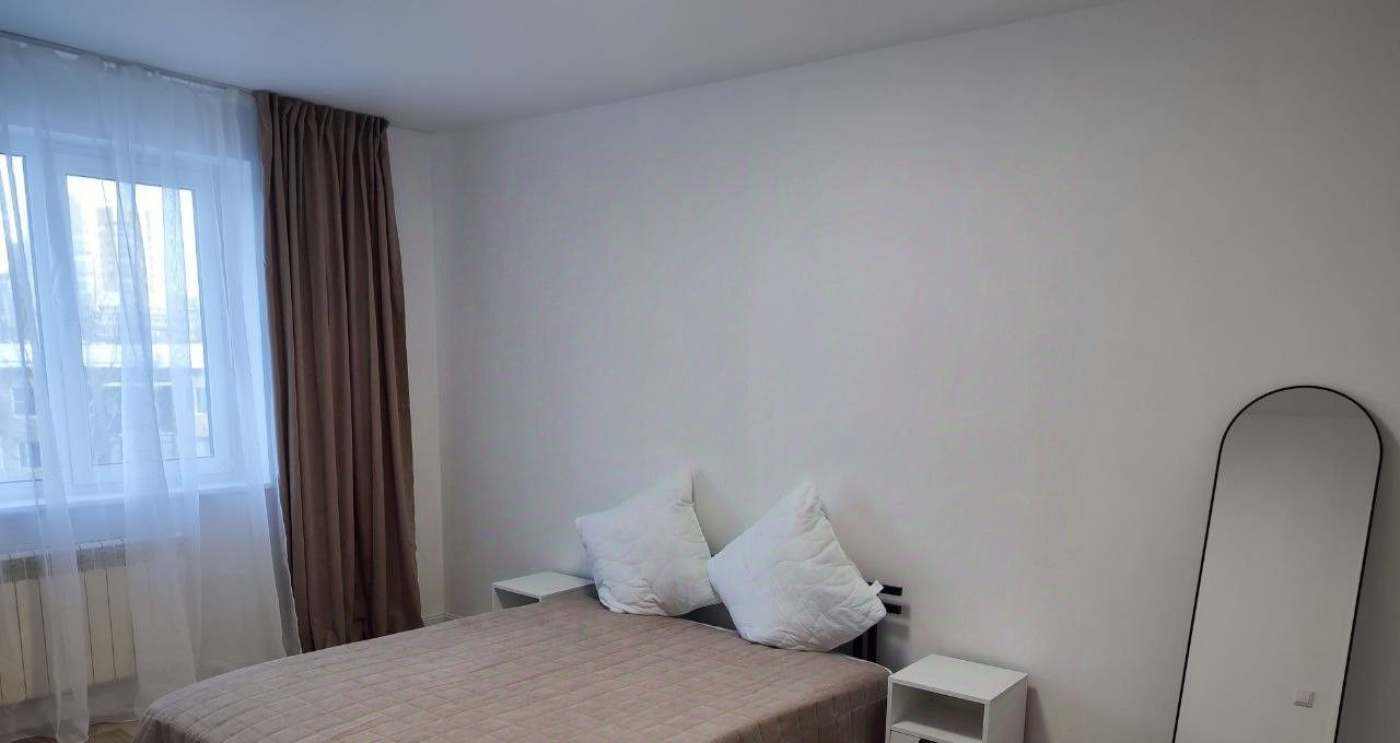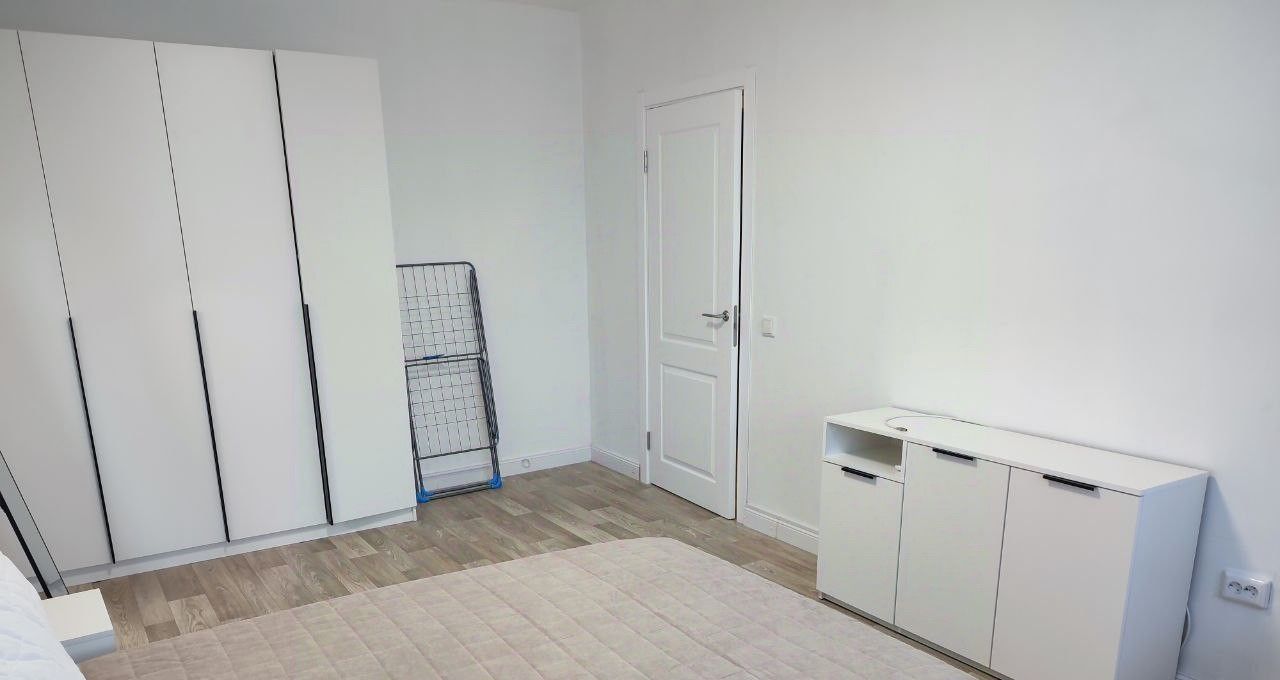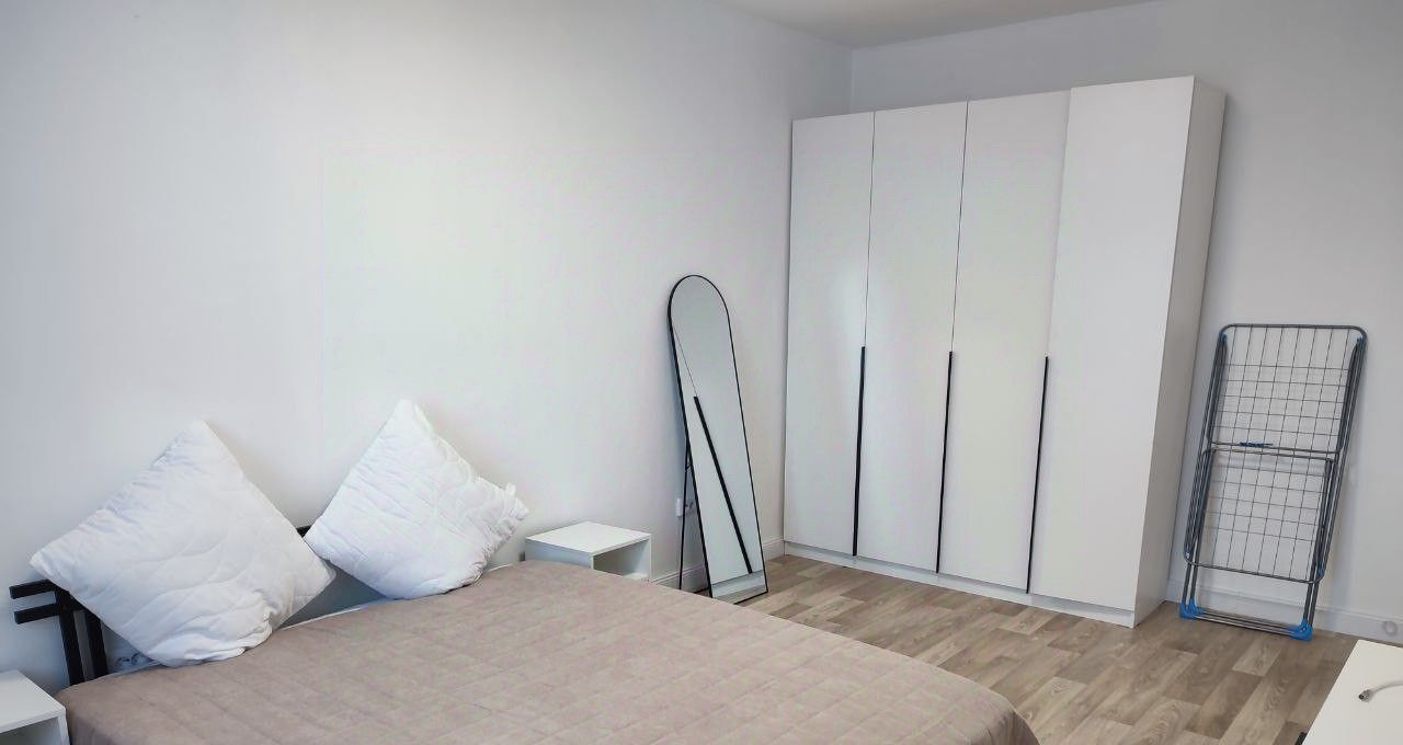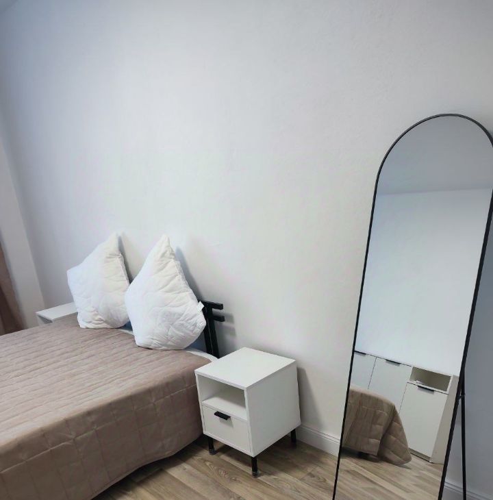 В комнате новый пружинный ортопедический матрас , большой шкаф с отделением для вешалок и многочисленными полками, комод, зеркало, прикроватные тумбочки.