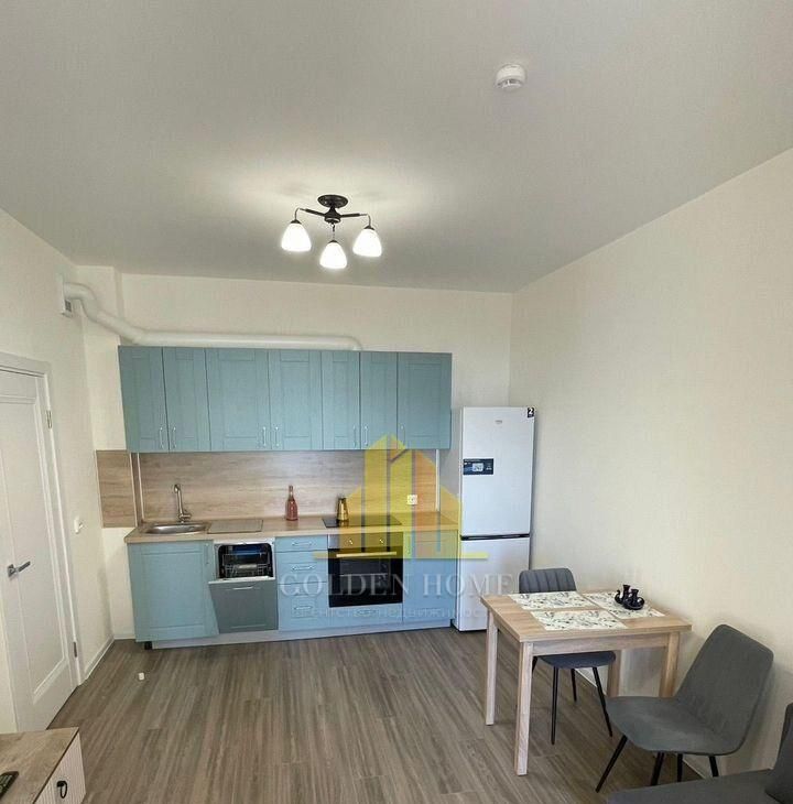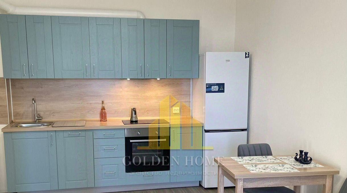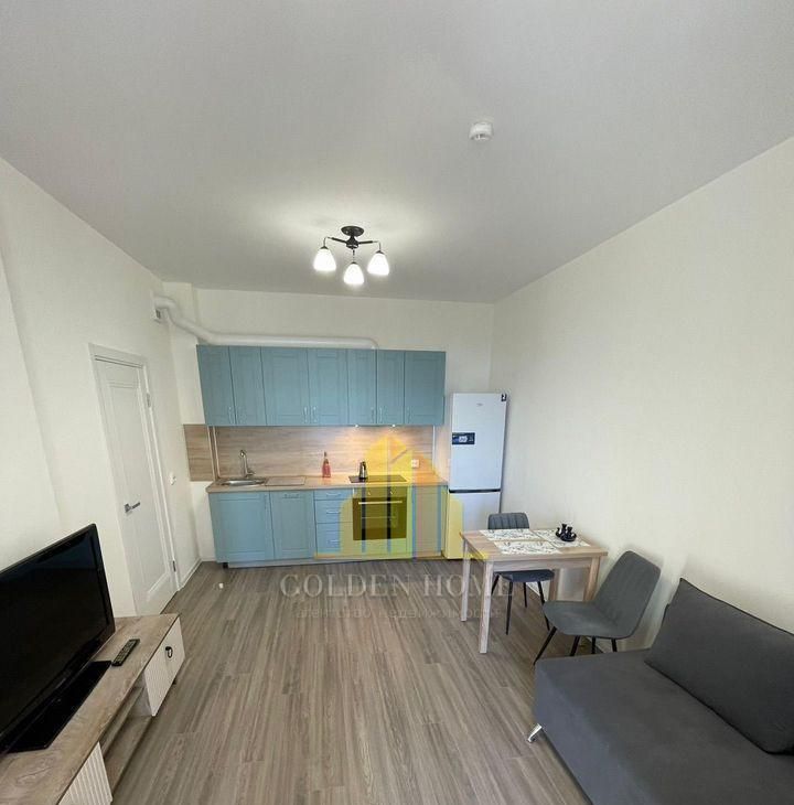 Встроенная посудомойка, духовой шкаф, индукционная варочная панель, встроенная вытяжка, полноразмерный холодильник, кухонный раскладной стол, два мягких стула, раскладной диван, тумба под телевизор , телевизор б/у, плотные шторы и др.