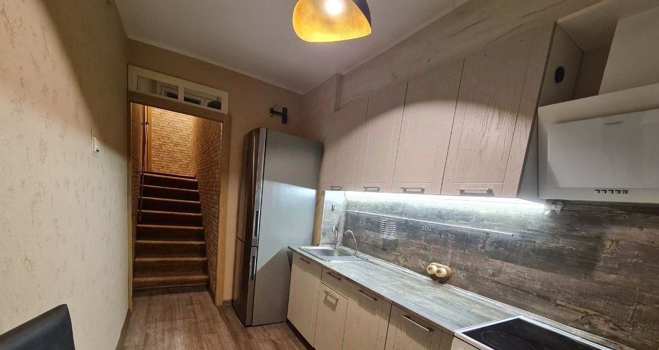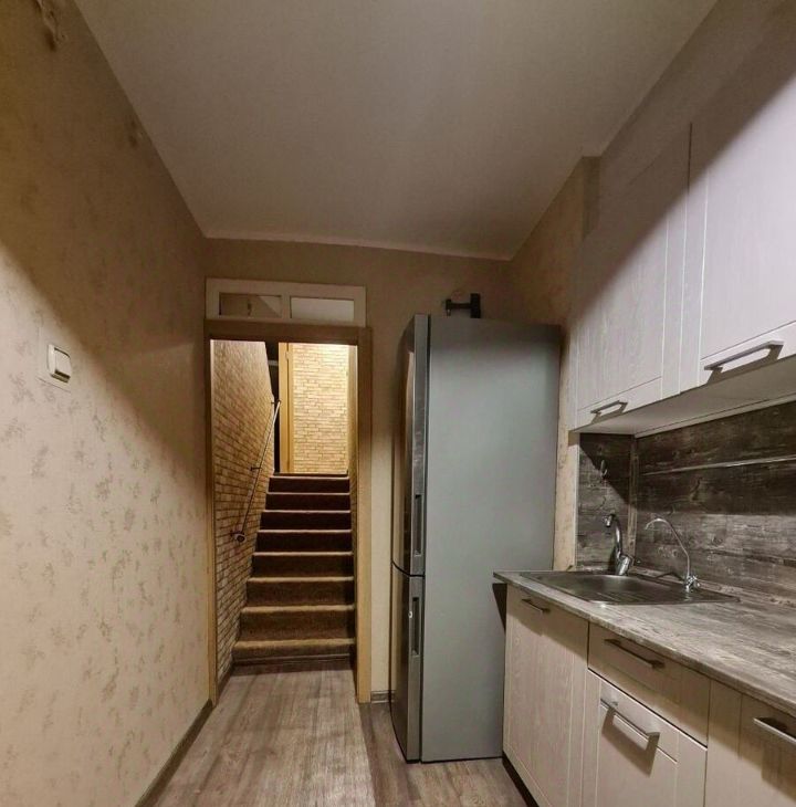 Квартира трехуровневая: из прихожей лестничный пролет вниз ведет к комнате и санузлу, следующий лестничный пролет ведет вниз из комнаты к кухне. Из комнаты выход на застекленную лоджию.
