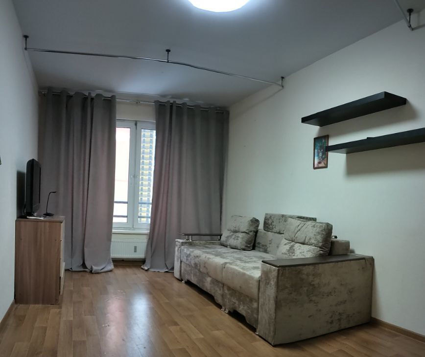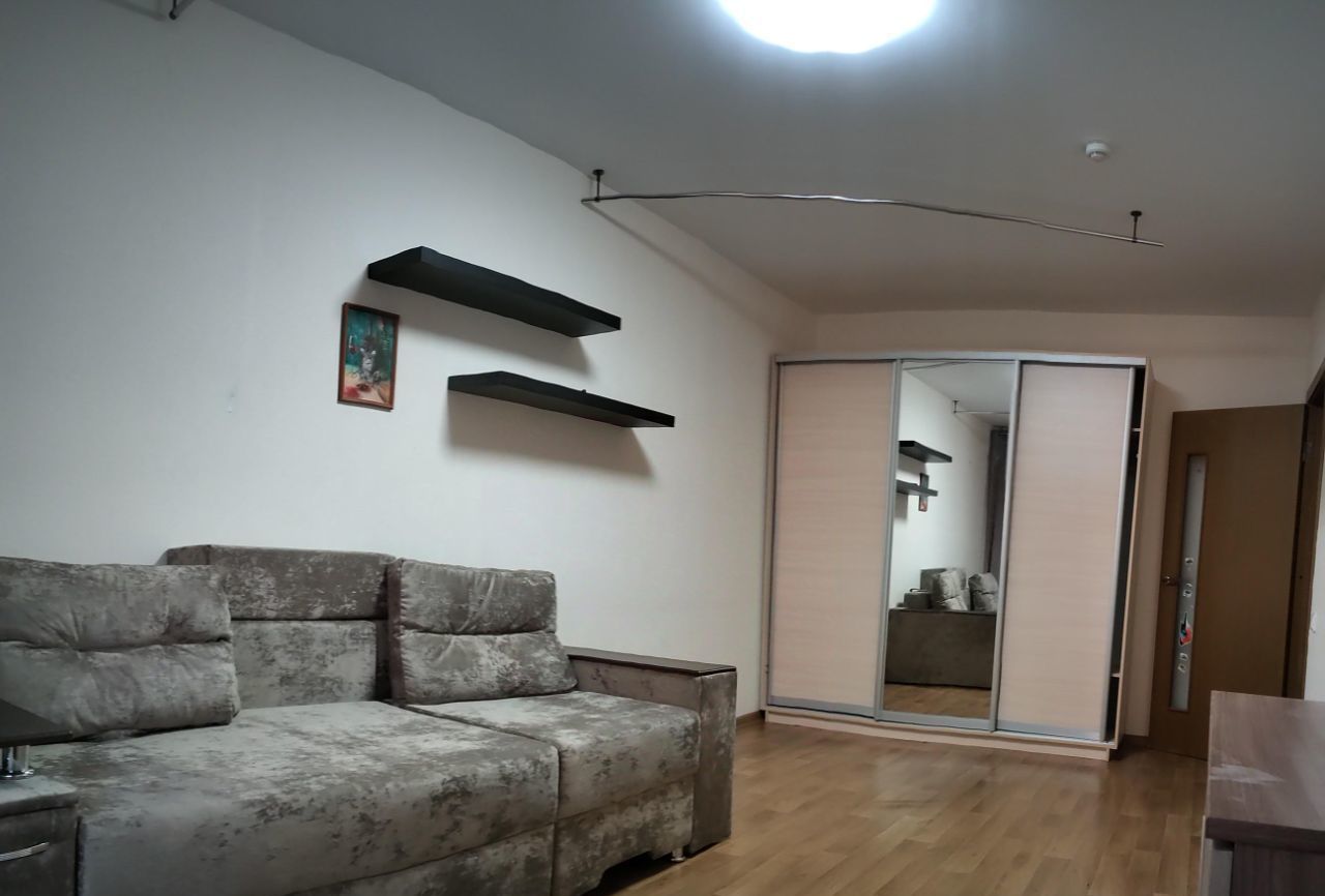- Основная комната: раскладывающийся диван, шкаф, в который поместится всё, есть комод.