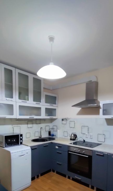 - Кухня: холодильник с морозильной камерой, микроволновка, духовой шкаф и варочная поверхность, посудомоечная машина, вытяжка, огромное количество мест для хранения.