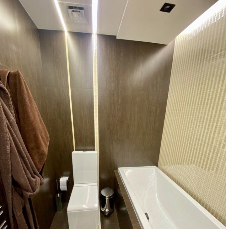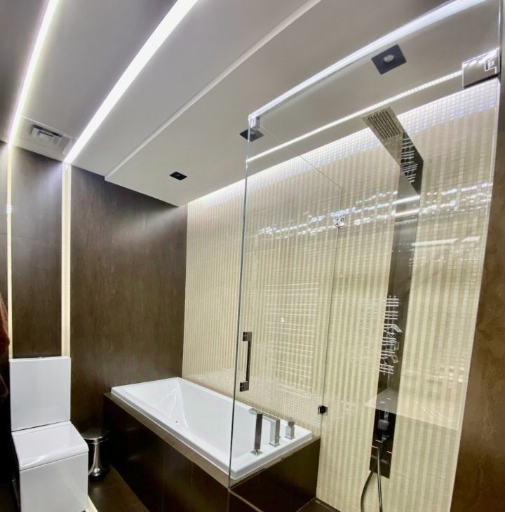 Стильный санузел с ванной и душевой зоной