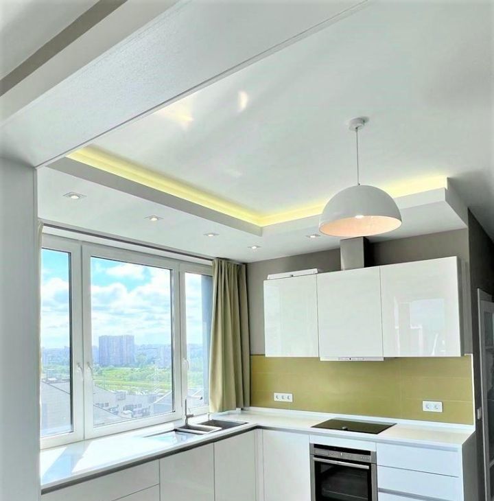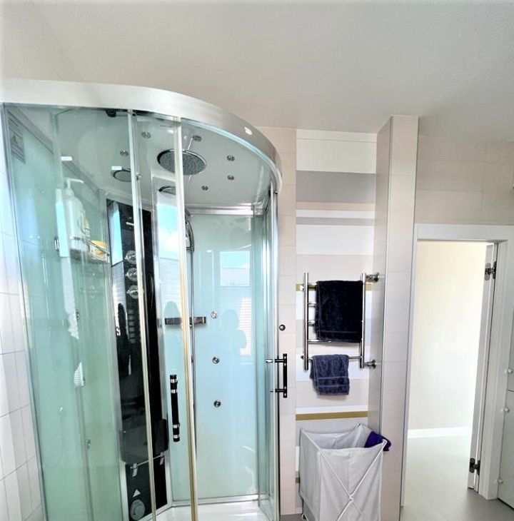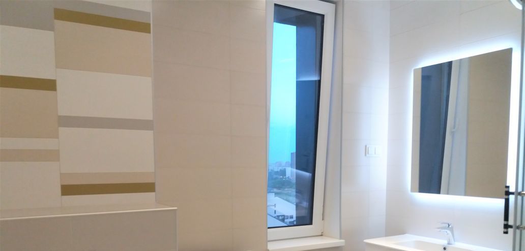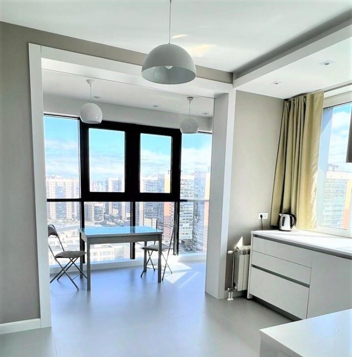 Состояние - идеальное, в квартире произведен качественный дорогостоящий ремонт с элементами дизайна. Просторная кухня-столовая, площадью 20 кв.м, с панорамным остеклением , светлая комната и большой санузел с окном, в котором установлена душевая кабина с гидромассажем.
