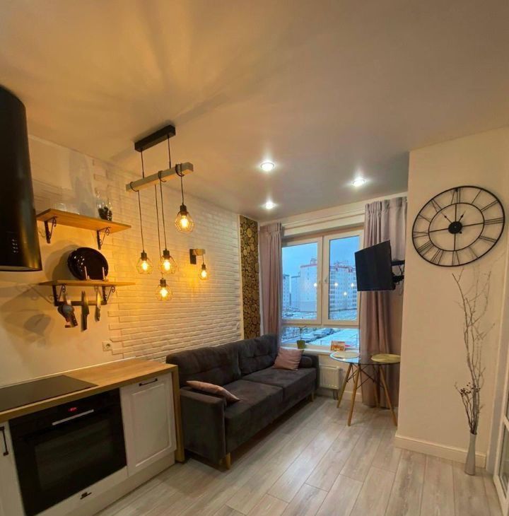 В кухне-гостиной установлен удобный двухспальный диван с отсеком для хранения вещей. Из окон открывается вид на городскую панораму.