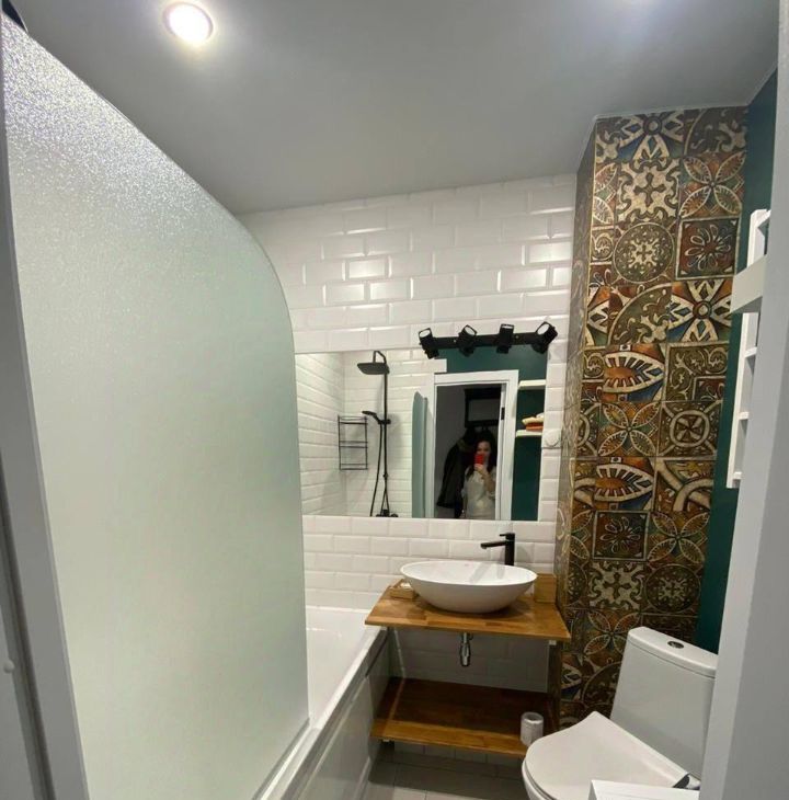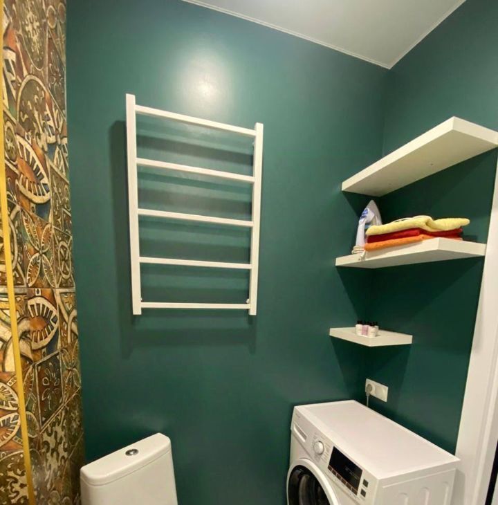Санузел совмещенный, оформлен стильной плиткой и оснащен современной сантехникой, новая сантехника и стиральная машина, деревянные ящики для скрытого хранения вещей , теплая полотенцесушилка .