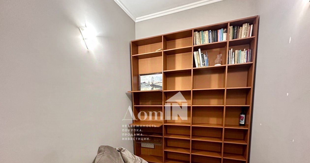 - Гостиная с книжной полкой и мягкими пуфиками для работы;