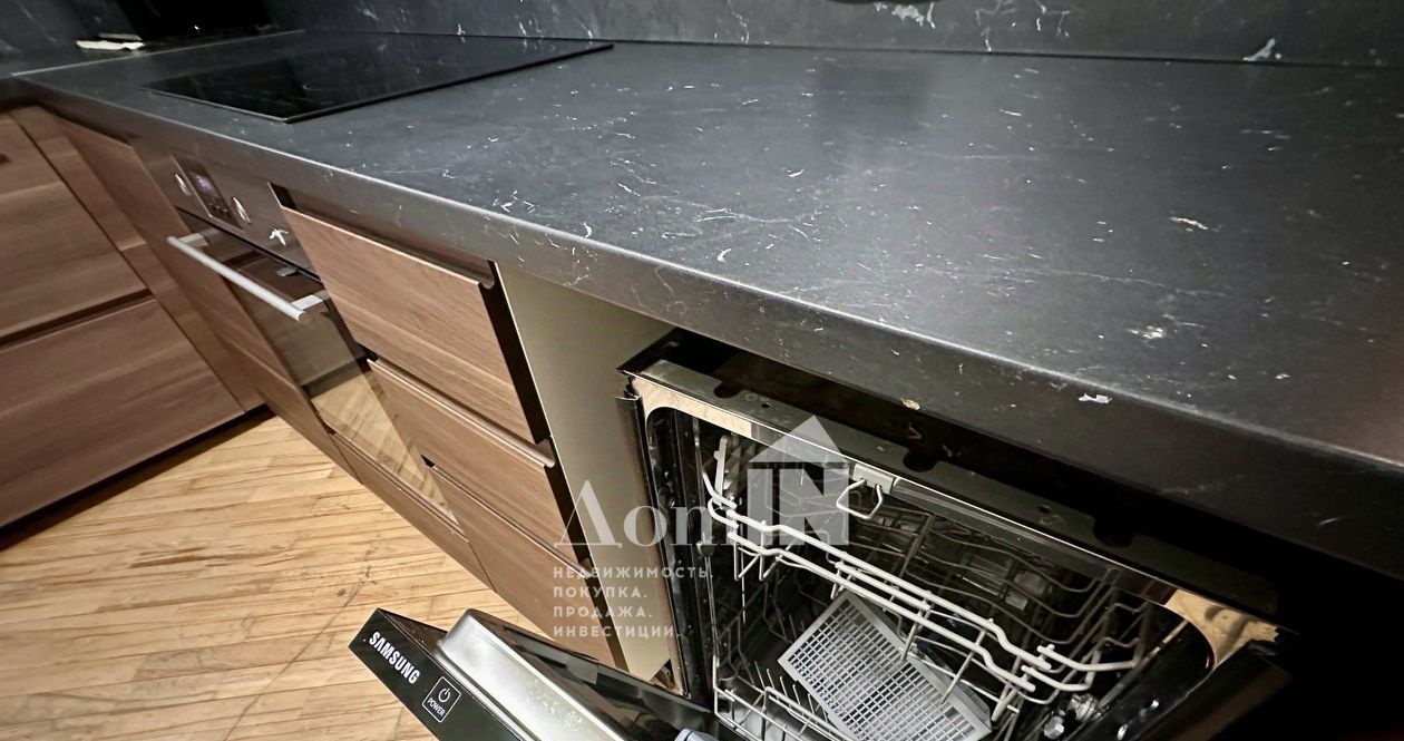 - Встроенная кухня с посудомоечной машиной, плитой, духовкой, вытяжкой и холодильником;