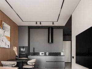 Кухня оборудованна функциональной бытовой техникой, кухонный гарнитур включает в себя большой количество полок для хранения посуды и приборов, а также барную стойку. Рядом с зоной готовки - пространство для отдыха, уютный диван и smаrt tv. Там же, выход на балкон, откуда открывается вид на внутренний двор ЖК.