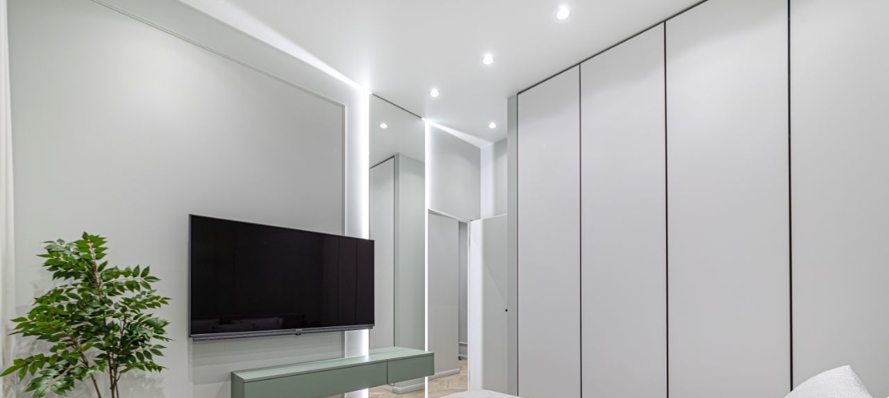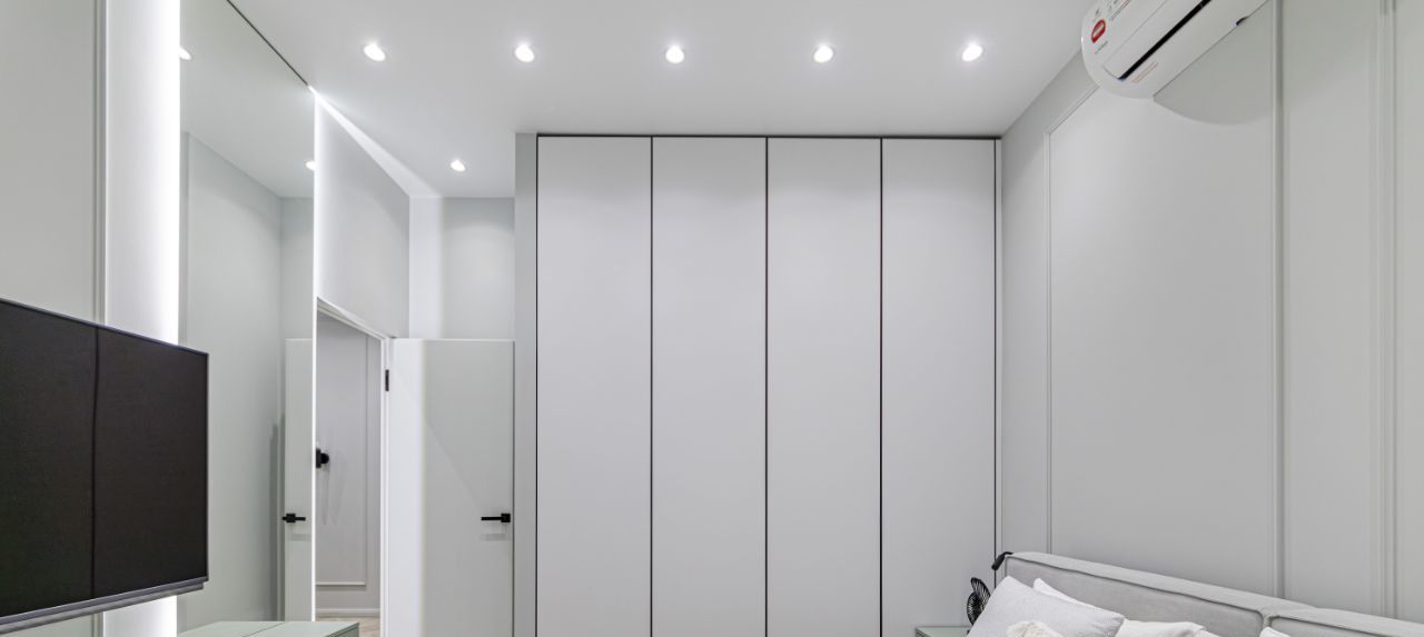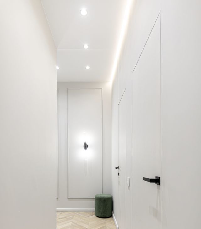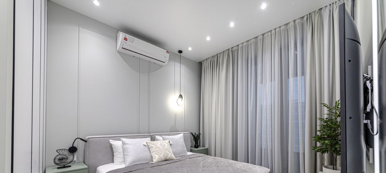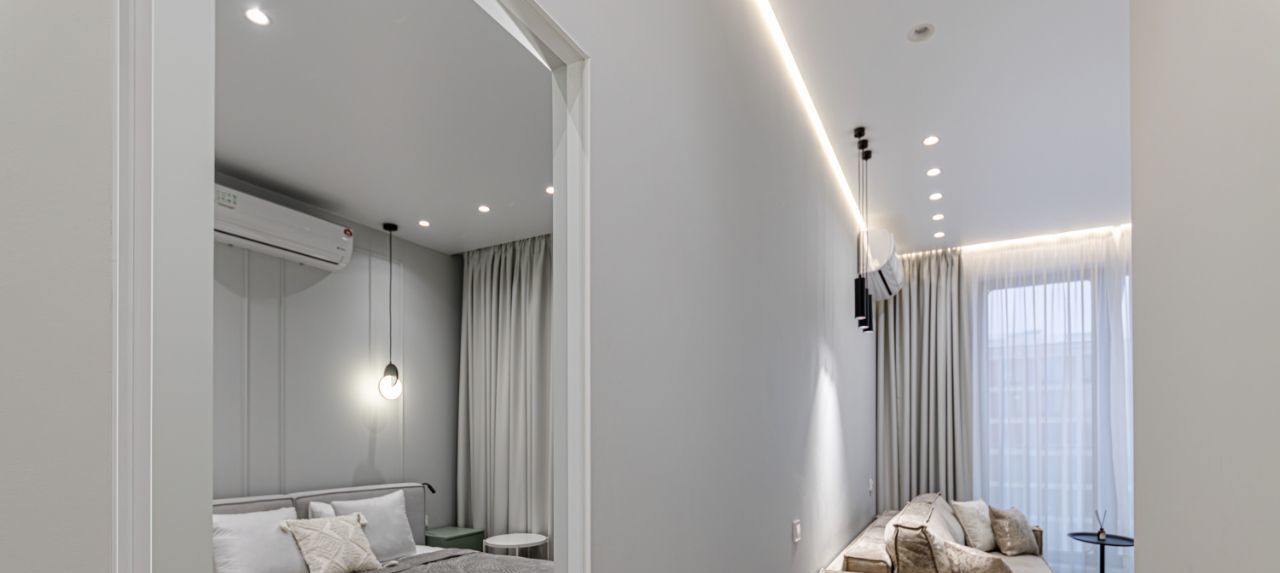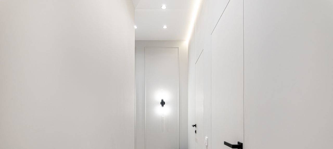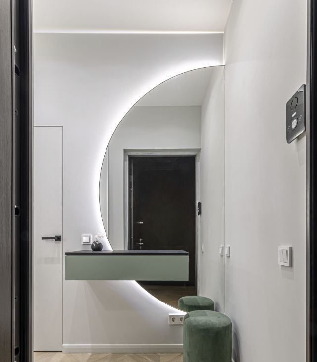 В квартире установлены кондиционеры в каждом помещении, теплые полы, конвекторы в полу, видеодомофон, также предусмотрено множество сценариев освещения для любого настроения и случая, много мест хранения.