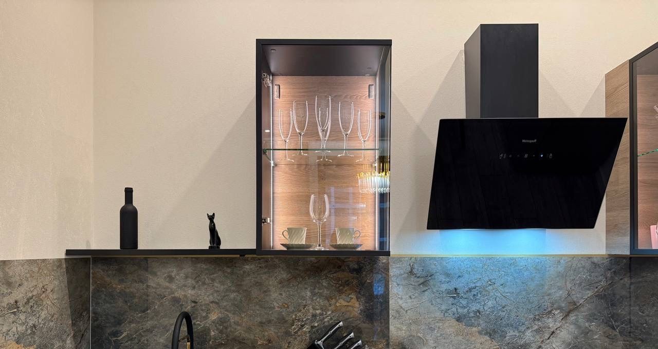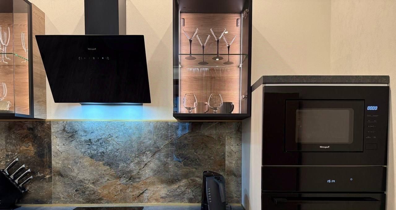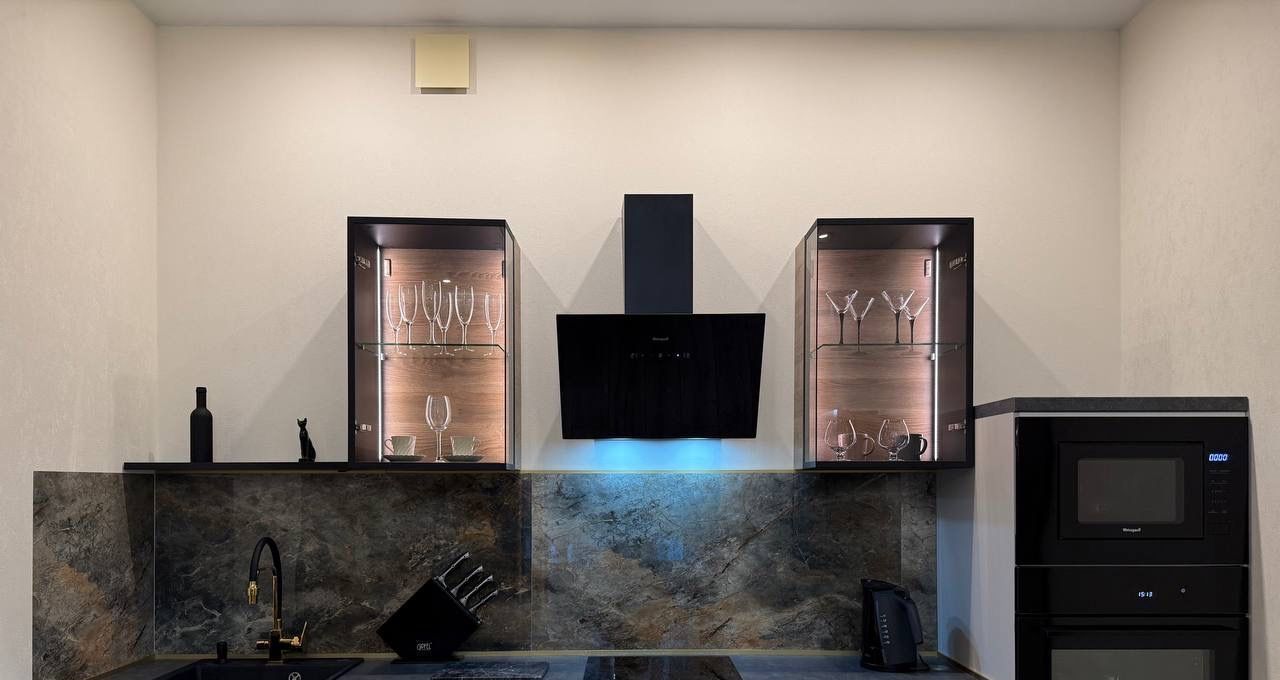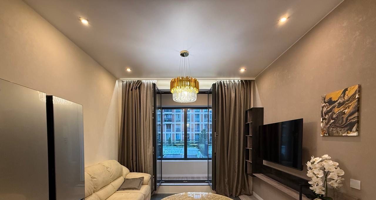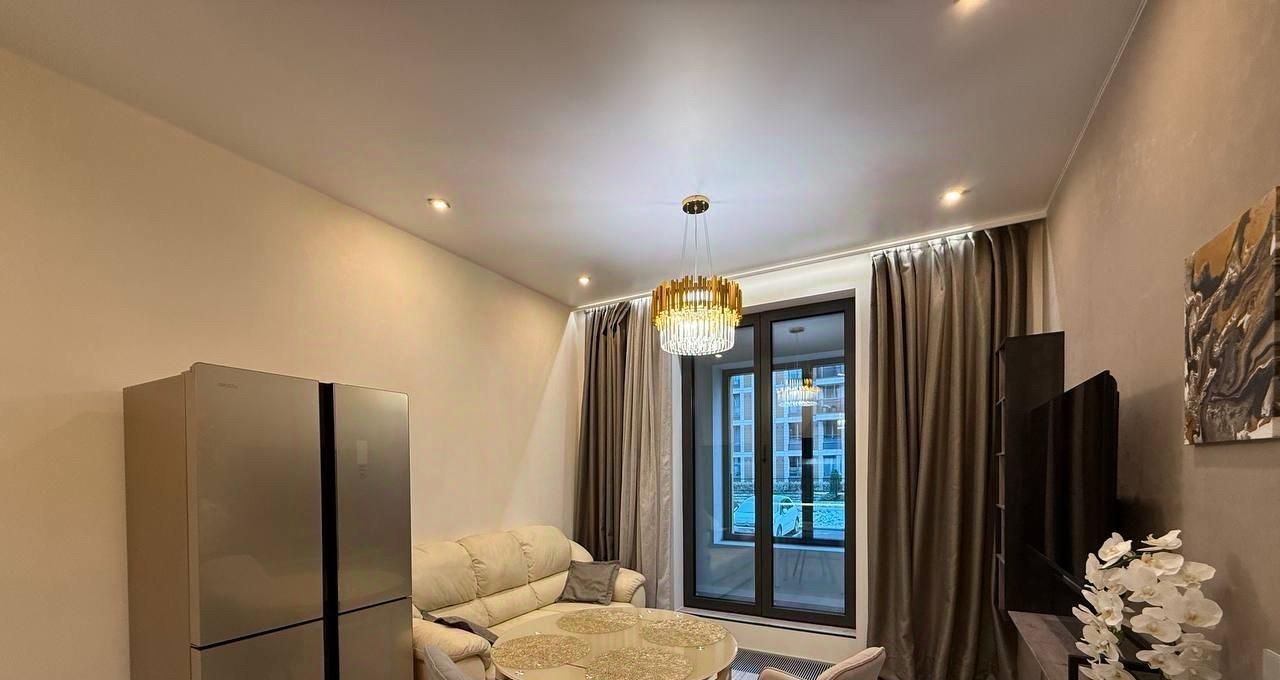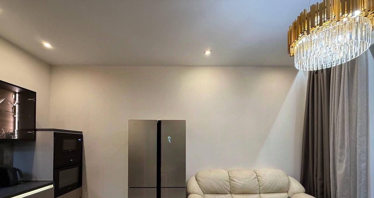 Просторная кухня оснащена современной техникой, включая холодильник и духовой шкаф. В комнате установлен кондиционер и телевизор. Из мебели — вместительные шкафы и удобный диван.
