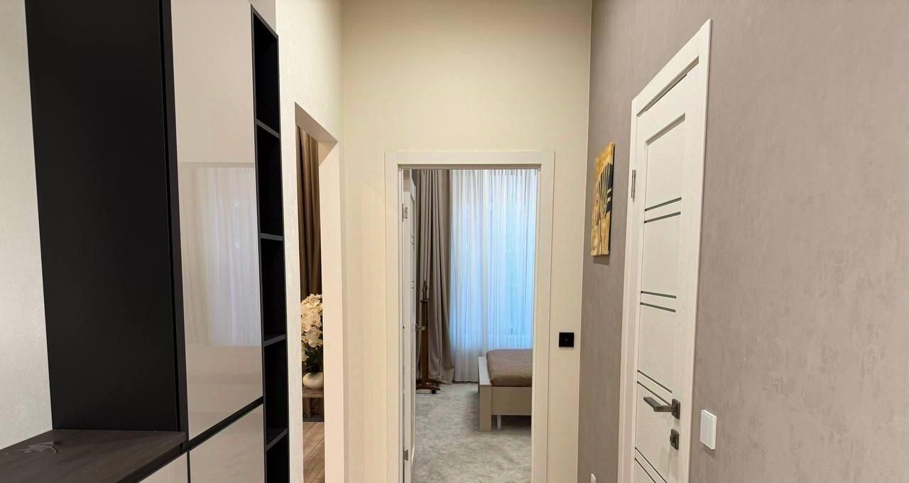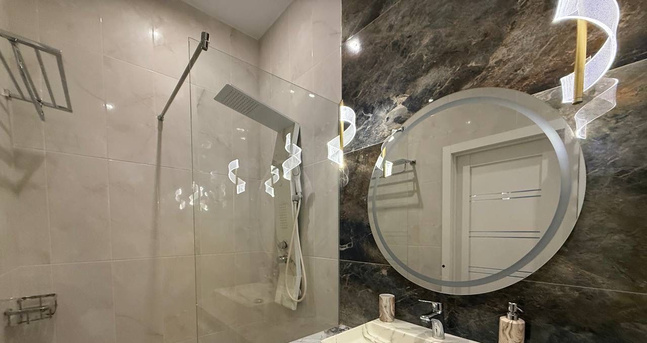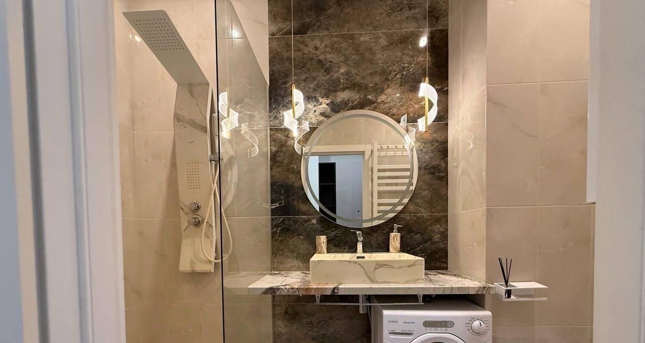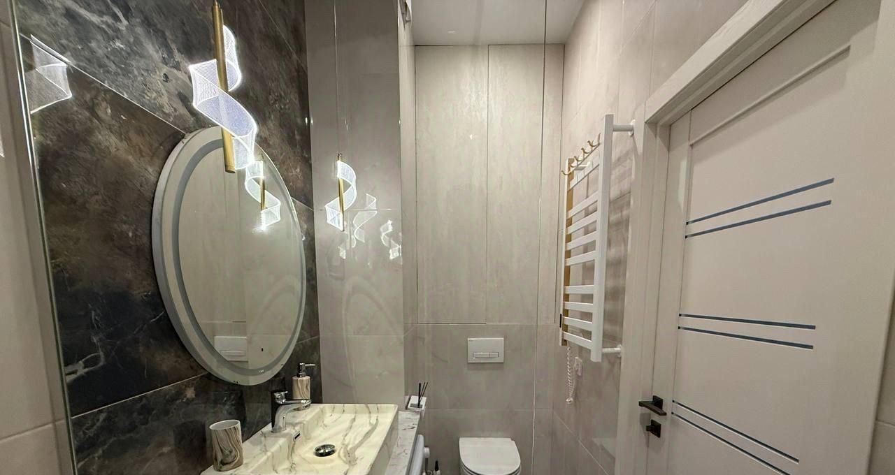 Санузел совмещённый, выполнен в стильном мраморном оформлении. Лоджия застеклена и оборудована мебелью для комфортного отдыха. Дом находится в районе с развитой инфраструктурой, рядом подземная парковка и детская площадка.