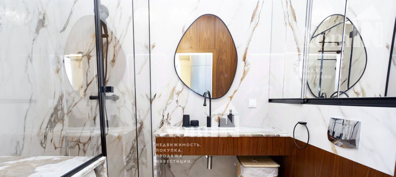 В квартире выполнен дизайнерский ремонт с применением высококачественных современных материалов. В интерьере использованы натуральный камень и дерево.