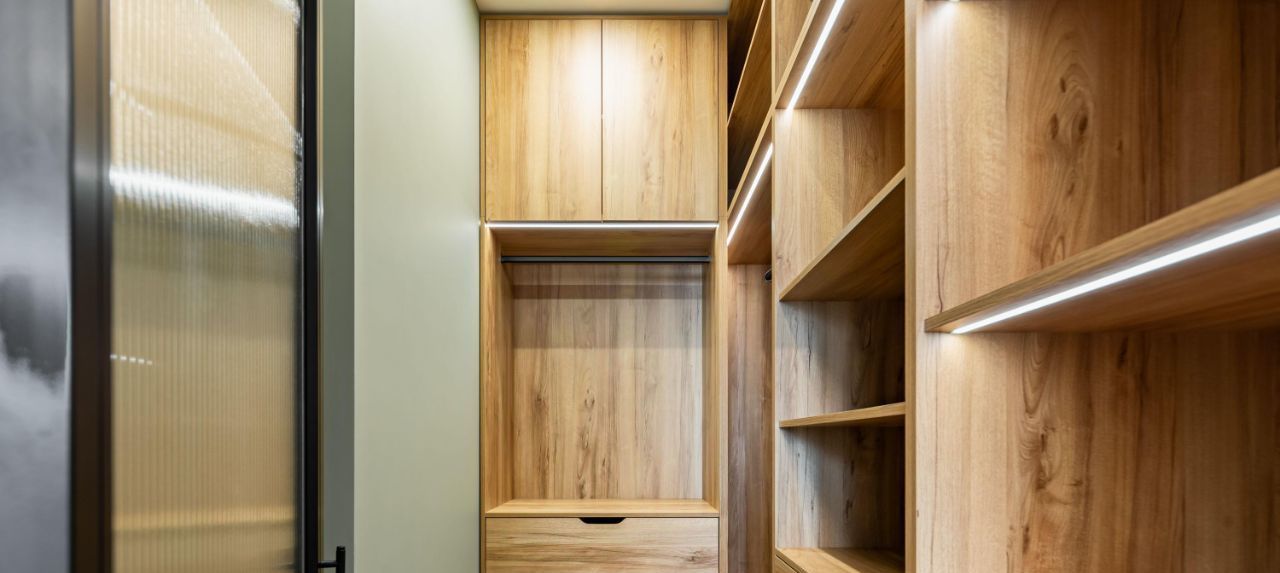 — шпонированные панели и встроенная мебель