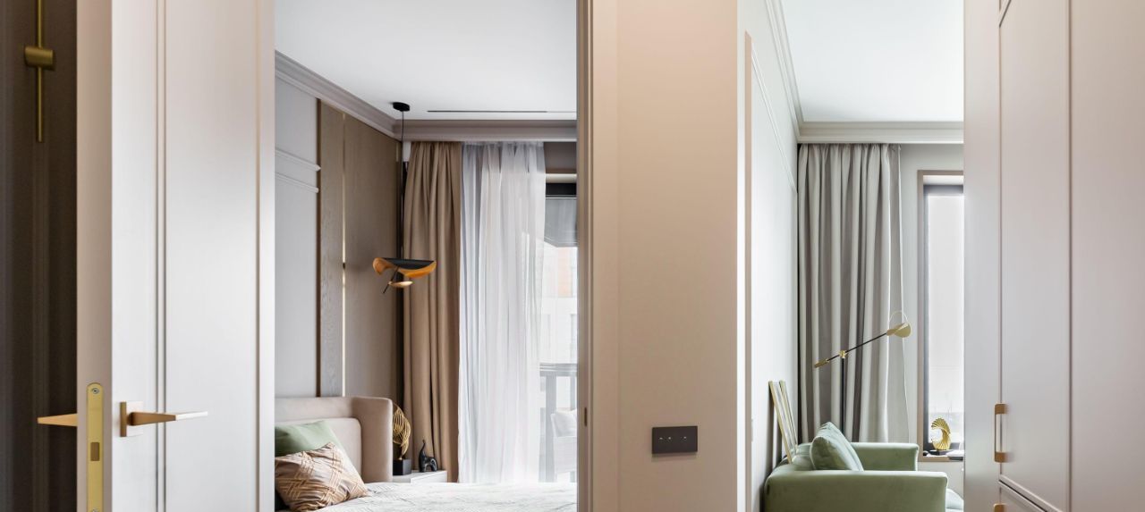 Интерьер выполнен в спокойной современной классике с акцентом на натуральные материалы и фактуры. Светлая гамма, мягкое освещение и продуманные детали создают ощущение уюта и дорогой тишины.