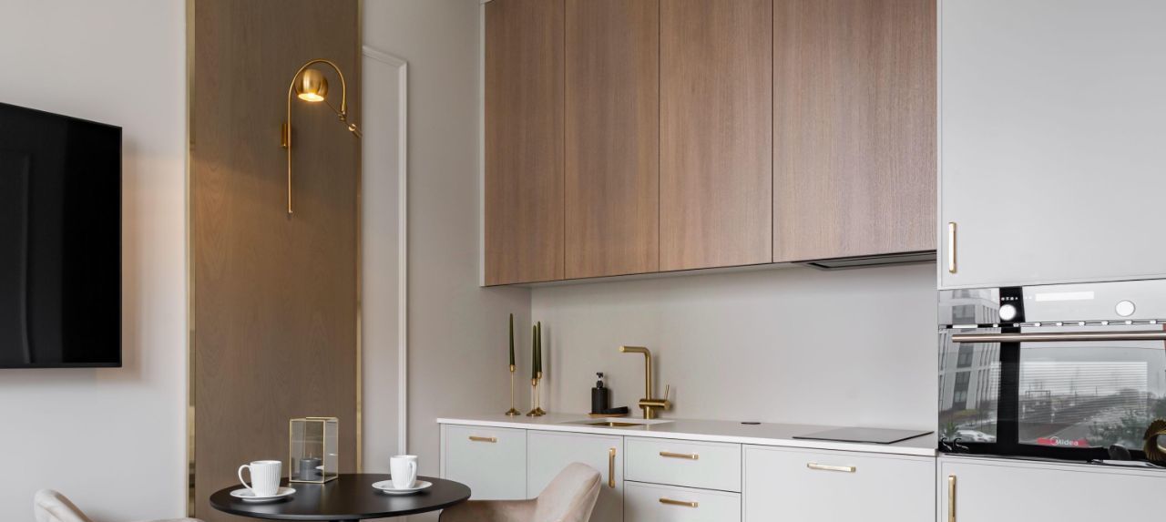 — кухня: МДФ в эмали и натуральный шпон, керамогранит в рабочей зоне