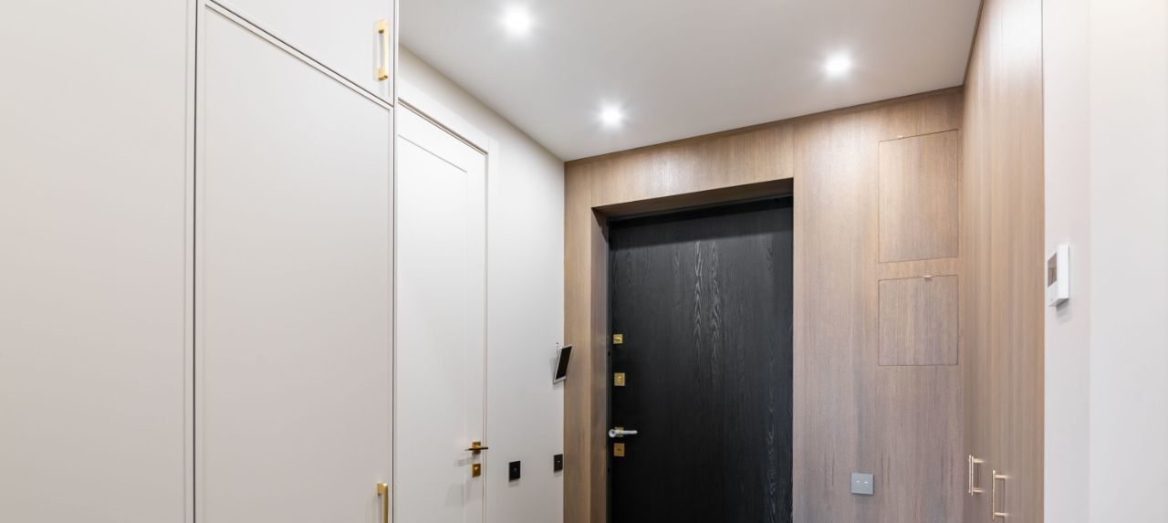 — холл: шкафы и панели из шпона, напольная плитка
