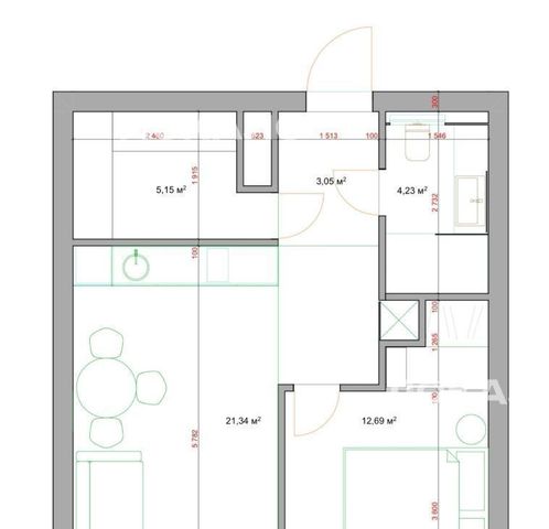 Kуxня-гocтинaя — 21 м², спaльня — 13 м²