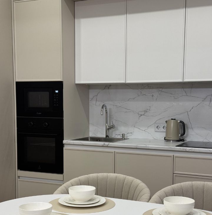 Просторная кухня-гостиная: здесь достаточно места для приготовления еды, обедов и комфортного отдыха. Кухня оборудована современной бытовой техникой.