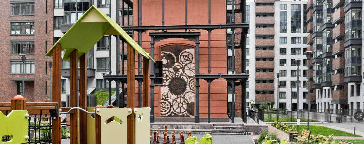 Комплекс комфорткласса с закрытой территорией, подземным паркингом и продуманным благоустройством. На дворовой площадке — современные детская и спортивная зоны, озеленение и аккуратные прогулочные дорожки.