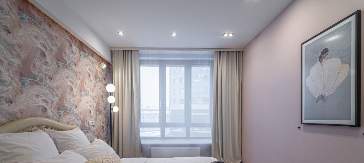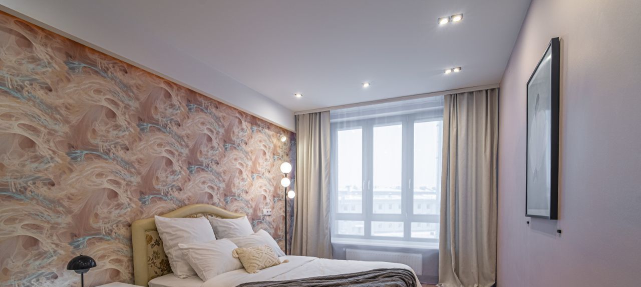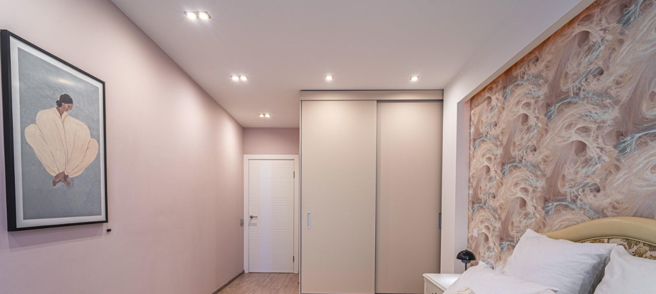 * Тихая и уютная спальня (17 м²) с выверенной атмосферой уединения. В комнате много света и воздуха. Полная комплектация: большая кровать с новым текстилем, мягкая зона с ковром и глубокий шкаф-купе. Разноуровневый свет добавляет пространству домашнего тепла и юта.