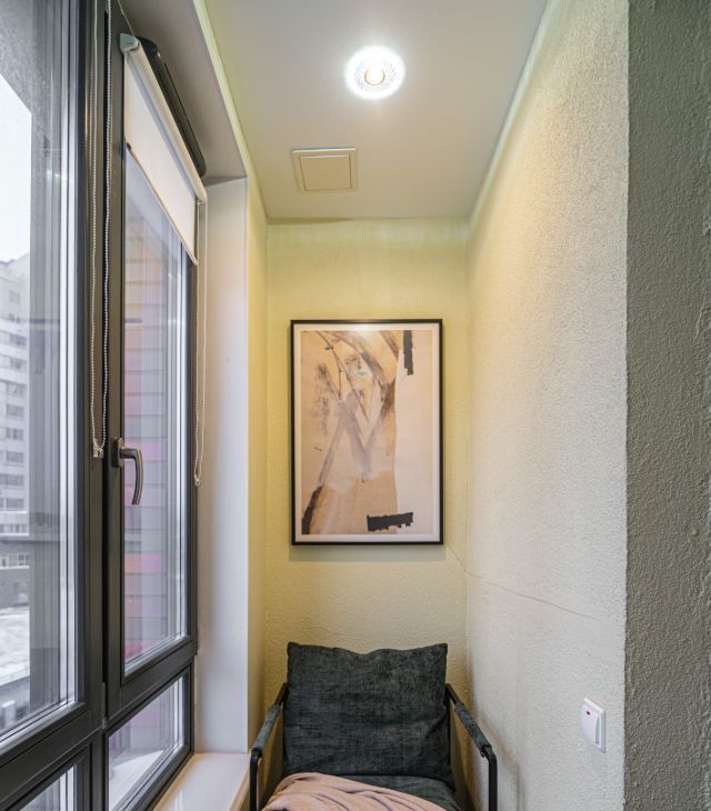 * Утепленная лоджия с подогревом пола и мягким креслом — идеальное место для уединения с книгой, ноутбуком или чашкой кофе в коне дня.