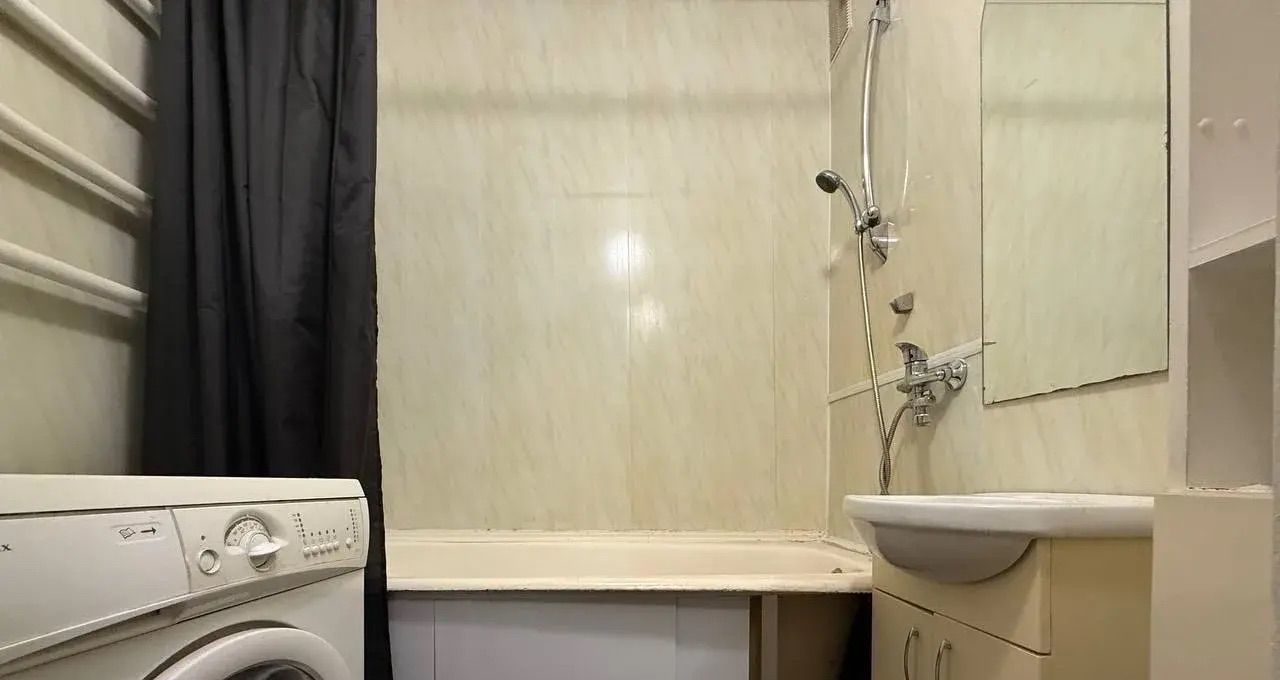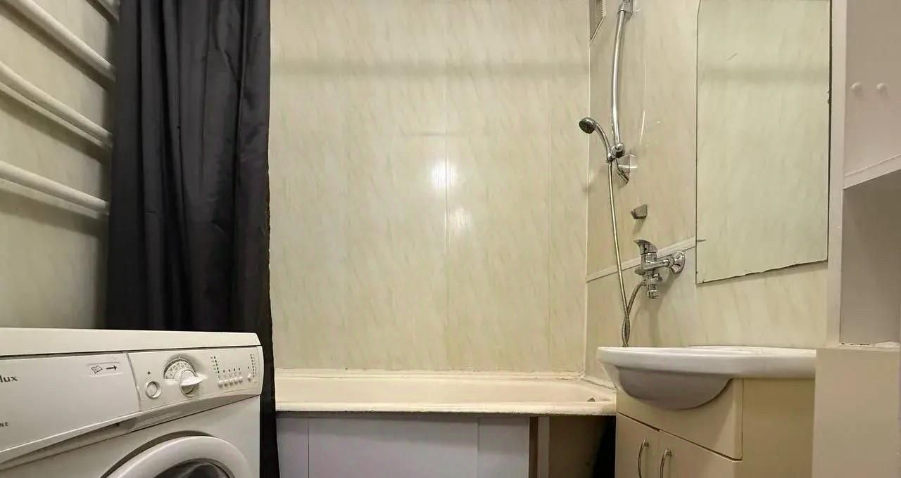 Санузел раздельный. В ванной имеется стиральная машина (остается). Между санузлом и кухней большая кладовка.