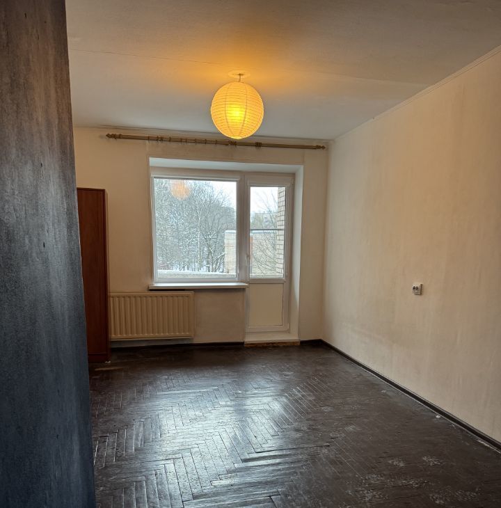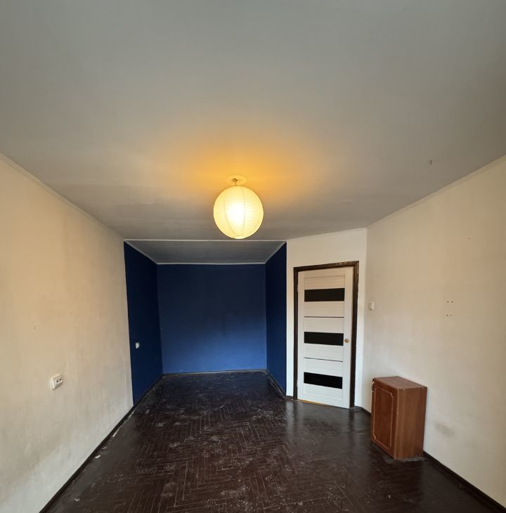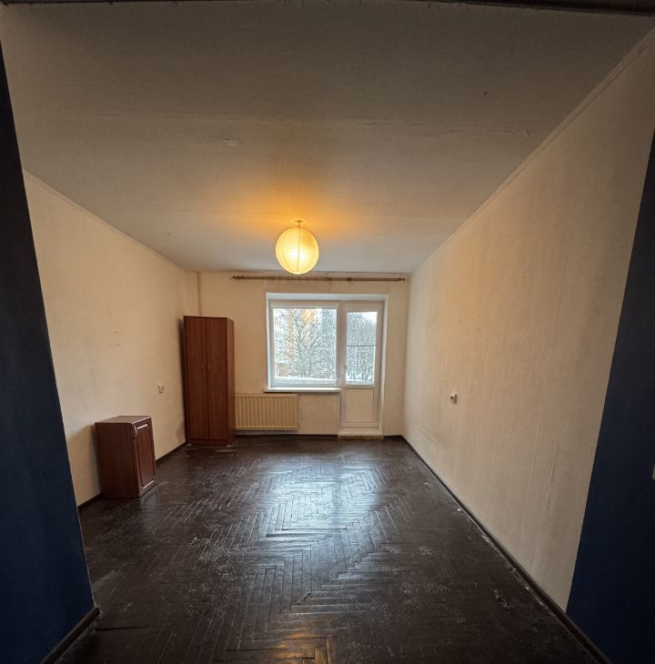 Комната имеет углубление, где хорошо встаёт кровать или гардероб. Есть балкон в комнате.