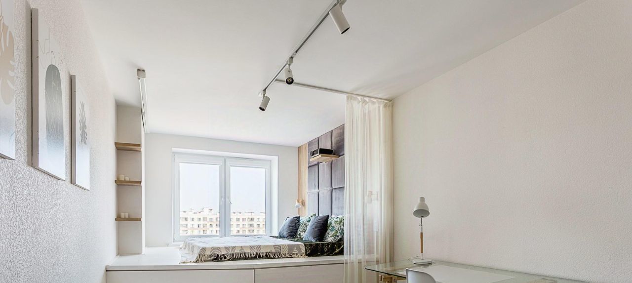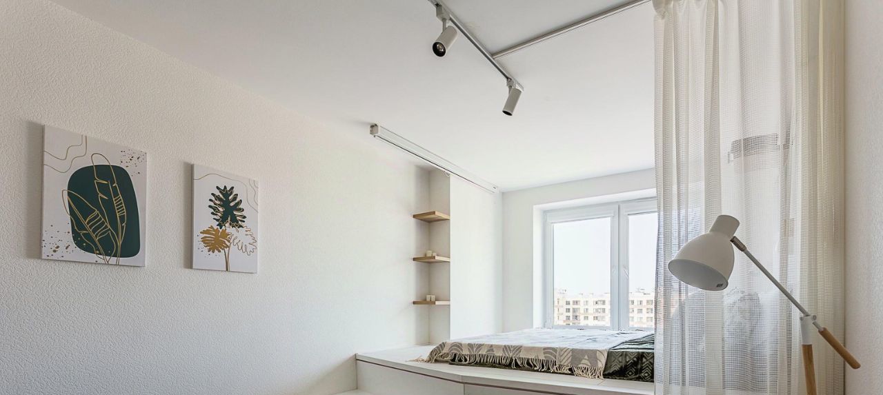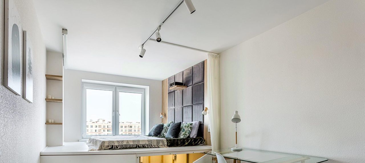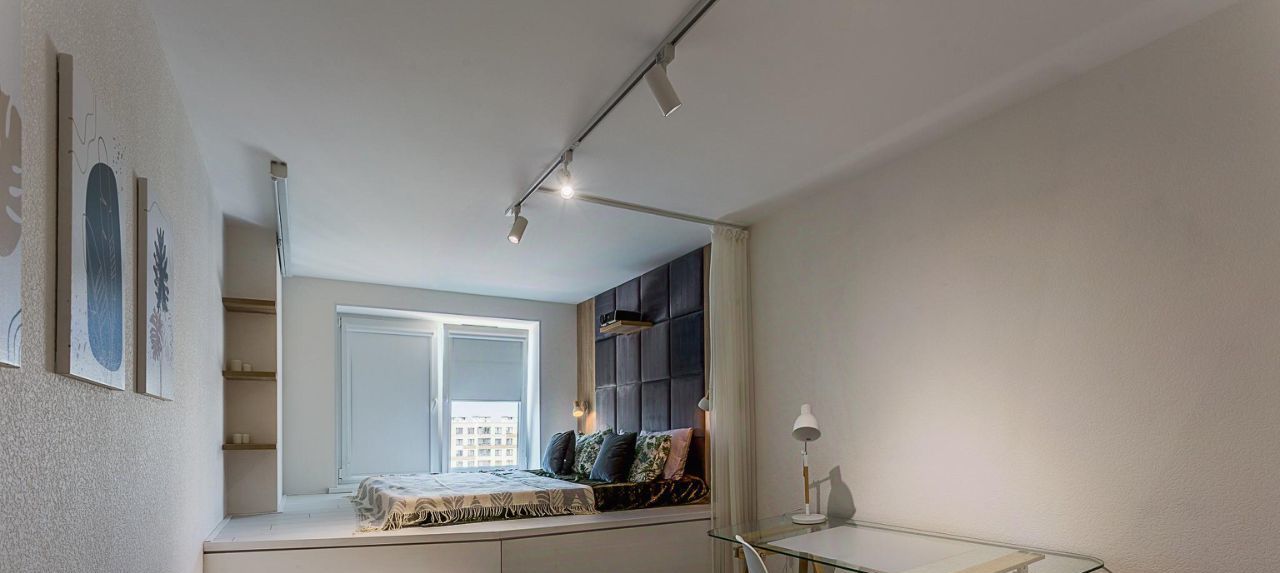 В комнате по индивидуальному заказу сделан подиум с двуспальным ортопедическим матрасом, экраном и полкой для проектора, продумано освещение. Оборудовано удобное рабочее место. Есть отдельная гардеробная, под подиумом много места для хранения вещей.