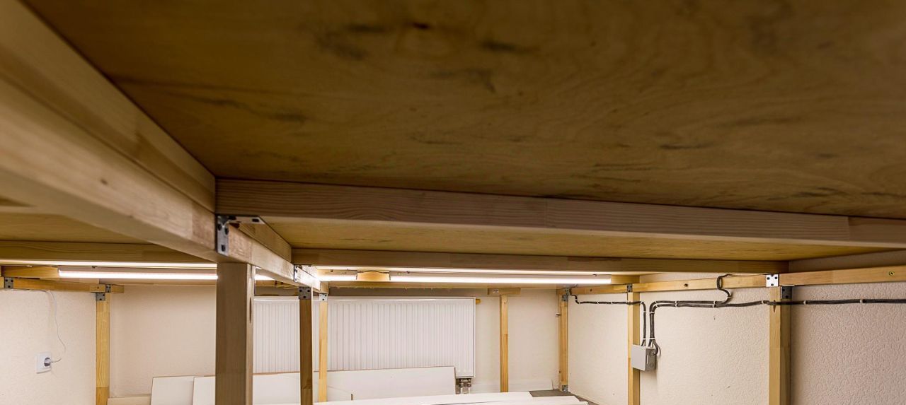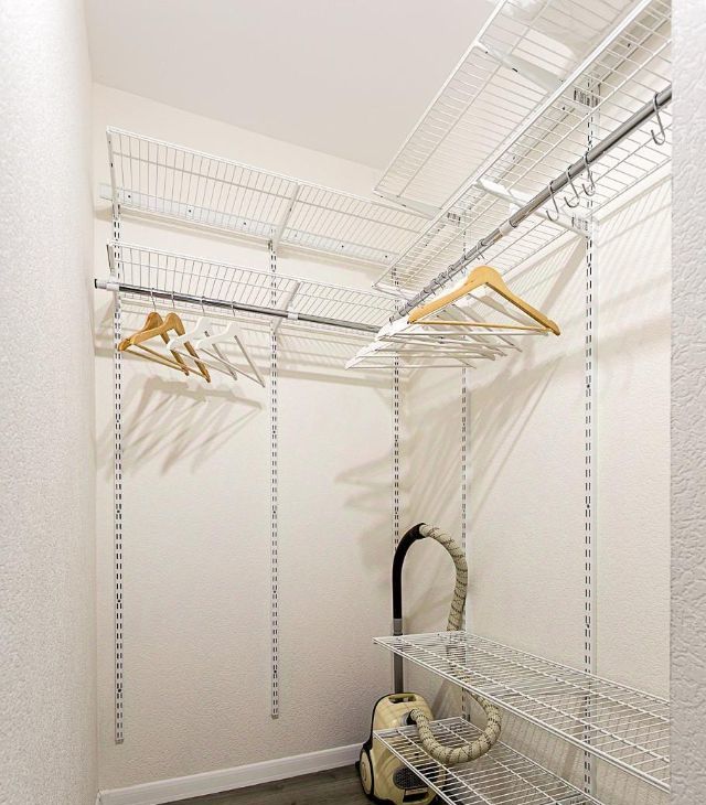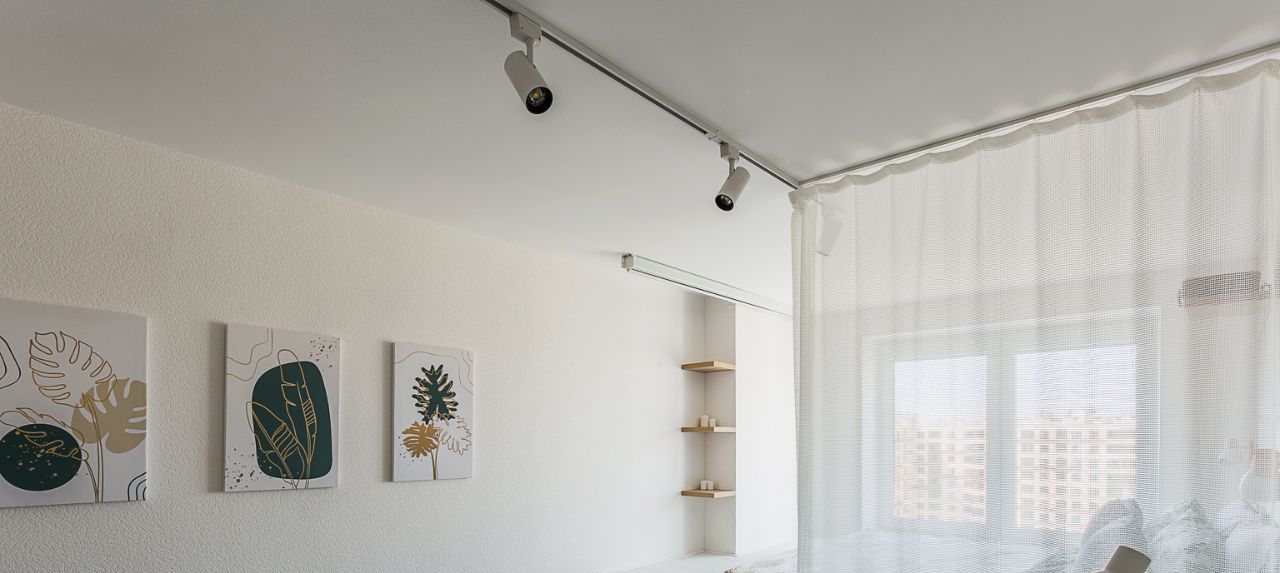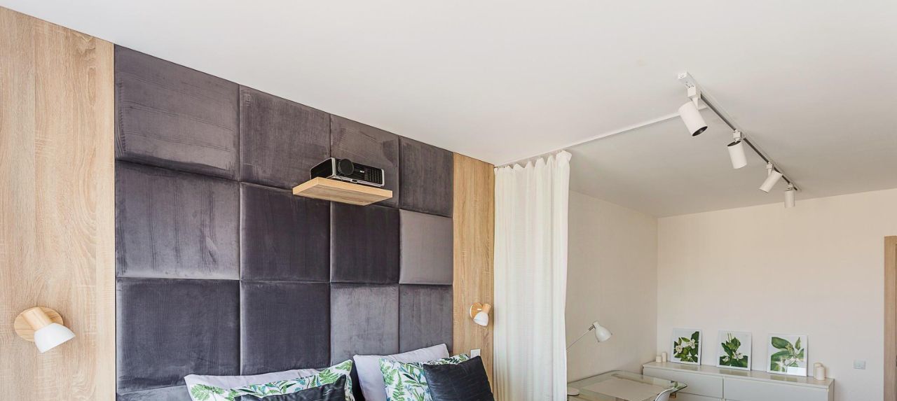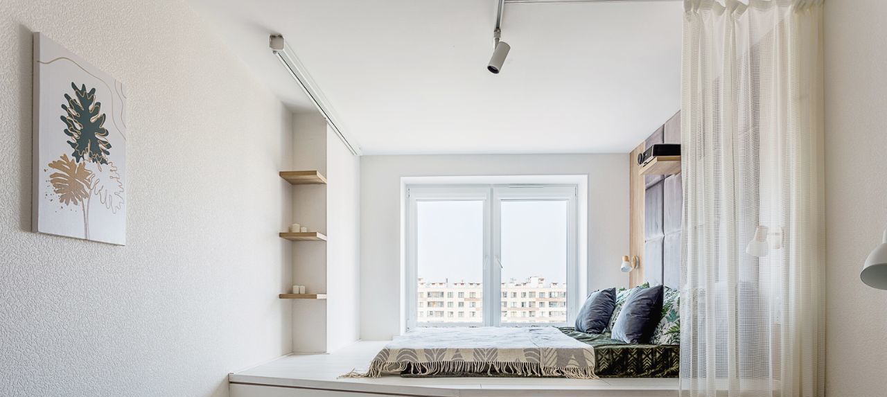 В комнате по индивидуальному заказу сделан подиум с двуспальным ортопедическим матрасом, экраном и полкой для проектора, продумано освещение. Оборудовано удобное рабочее место. Есть отдельная гардеробная, под подиумом много места для хранения вещей.